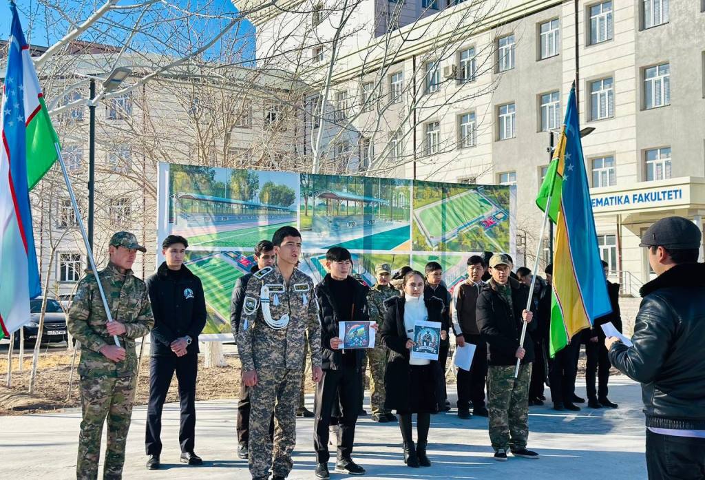 Jaslardı watan súyiwshilik ruwxında tárbiyalaw, olardıń fizikalıq hám áskeriy tayarlıqların sınaqtan ótkeriw maqsetinde shólkemlestirilgen jarısta studentler komandalarǵa bólingen halda óz komandasın tanıstırıw hám áskeriy qosıq aytıw, 100 metr aralıqqa juwırıw, qollardı búgip-jazdırıw, áskeriy shenlerdi izbe-izlikte aytıw sıyaqlı shártler tiykarında óz ara bellesti.