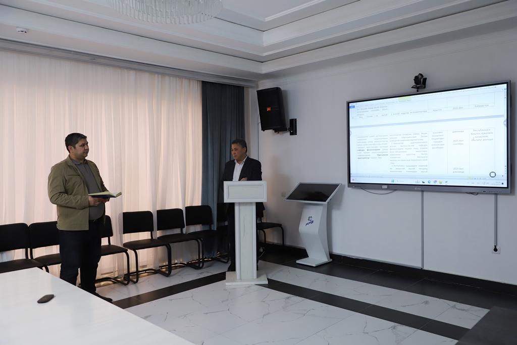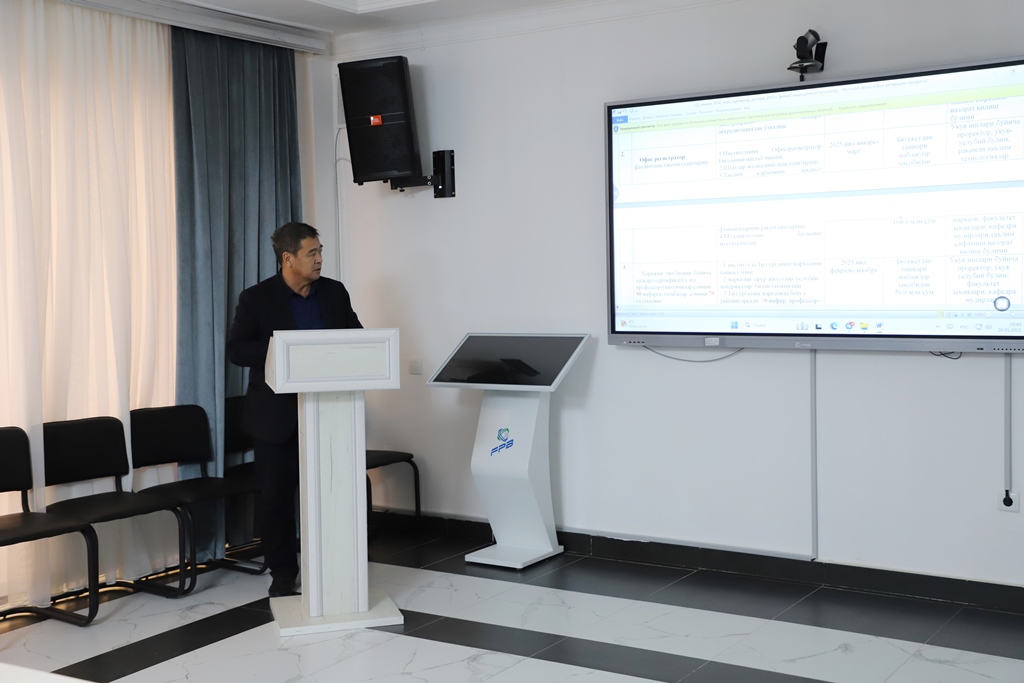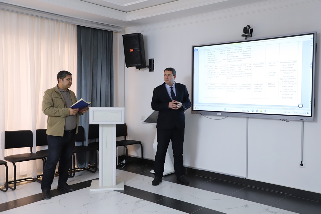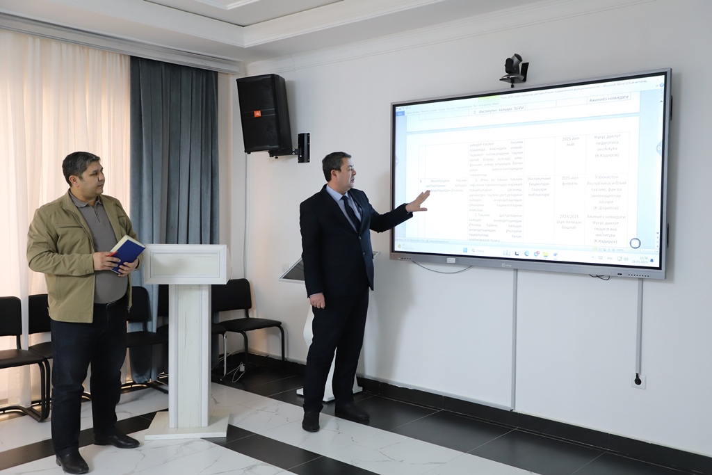 Jıynalısqa Ózbekstan Respublikası Joqarı bilimlendiriw, ilim hám innovaciyalar ministri, jumısshı topar baslıǵı Qońıratbay Sharipov qatnasıp, joqarı oqıw orınların hár tárepleme rawajlandırıw maqsetinde islep shıǵılǵan jol kartasınıń joybarları kórip shıǵıldı.