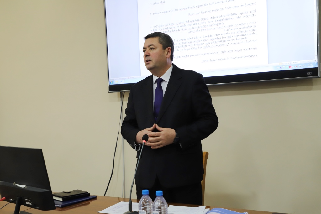 Bunnan soń Keńes májilisi kún tártibindegi Ózbekstan Respublikası Prezidenti Administraciyası hám Ózbekstan Respublikası Joqarı bilimlendiriw, ilim hám innovaciyalar ministri, sonday-aq, Qaraqalpaqstan Respublikası Joqarǵı Keńesi baslıǵınıń 2025-jılda instituttı hár tárepleme rawajlandırıwǵa baǵdarlanǵan Jol kartalarınıń tastıyıqlanǵanlıǵı hám alda turǵan wazıypalar, tańlaw jumısları, professor-oqıtıwshılardıń sabaqlardı ótiw sapası hám KPI sistemasın engiziw, 2025-jılda institutqa tayanısh doktorantura (PhD) hám stajyor-izleniwshilikke oqıwǵa qabıl etilgen izleniwshilerdiń teoriyalıq-metodologiyalıq oqıw baǵdarlamaları, jeke is-rejeleri, dissertaciya temaları hám ilimiy basshıların tastıyıqlaw, Ózbekstan Respublikası Joqarı bilimlendiriw, ilim hám innovaciyalar ministrligi janındaǵı Joqarı, orta arnawlı hám professional bilimlendiriw baǵdarları boyınsha oqıw-metodikalıq birlespeler xızmetin Muwapıqlastırıwshı keńesine oqıw ádebiyatların usınıw, ilimiy ataqlarǵa talaban bolǵan institut professor-oqıtıwshılarınıń hújjetlerin Joqarı attestaciyalıq komissiyasına usınıw, sonday-aq, aǵımdaǵı máseleler kórip shıǵılıp, tiyisli qararlar qabıl etildi.