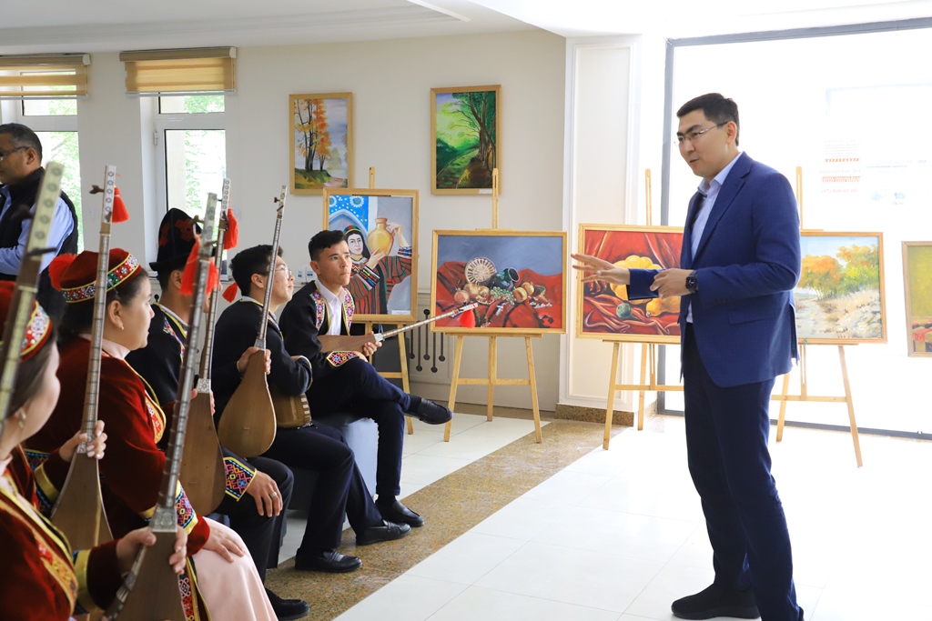Ilaj qatnasıwshıları dáslep institutı studentleriniń jetiskenleri, súwretlew hám qol óneri úlgileri, kitaplar kórgizbesi menen tanısıp, «Sıyperde» ansambliniń atqarıwındaǵı xalıq qosıqların tıńladı.