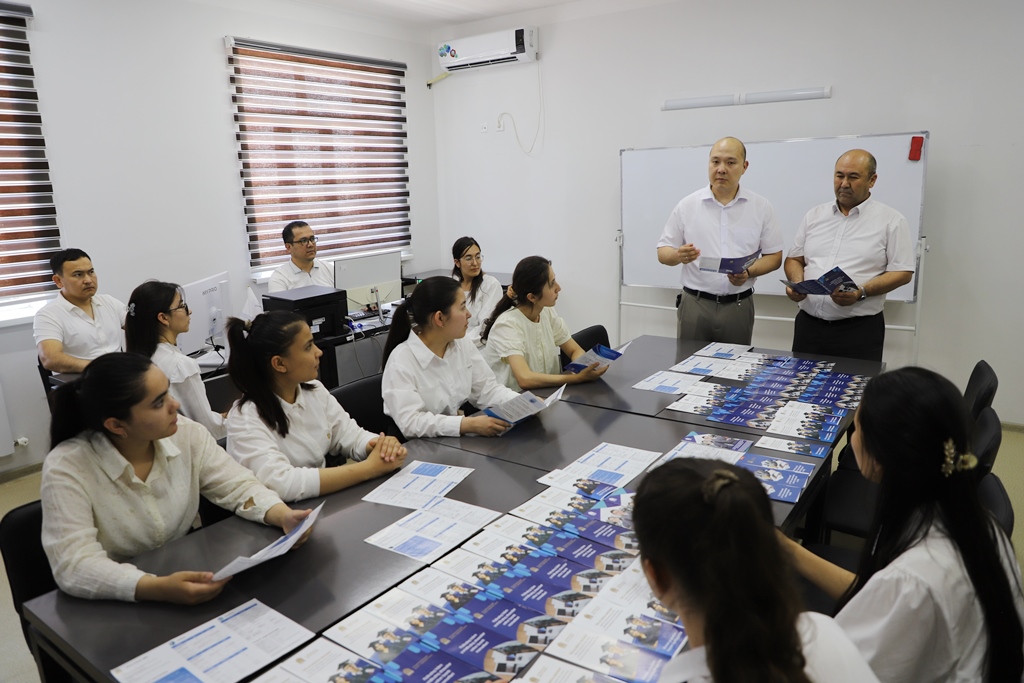 Registrator ofisi xızmet kórsetiw bóliminiń baslıǵı Bekmurat Tólepov Shet tilleri fakultetiniń pitkeriwshi kurs studentlerine «Keleshekke qádem» baǵdarlamasınıń mazmunı hám áhmiyeti jóninde tolıq maǵlıwmatlar berdi hám oray jumısları menen tanıstırdı.