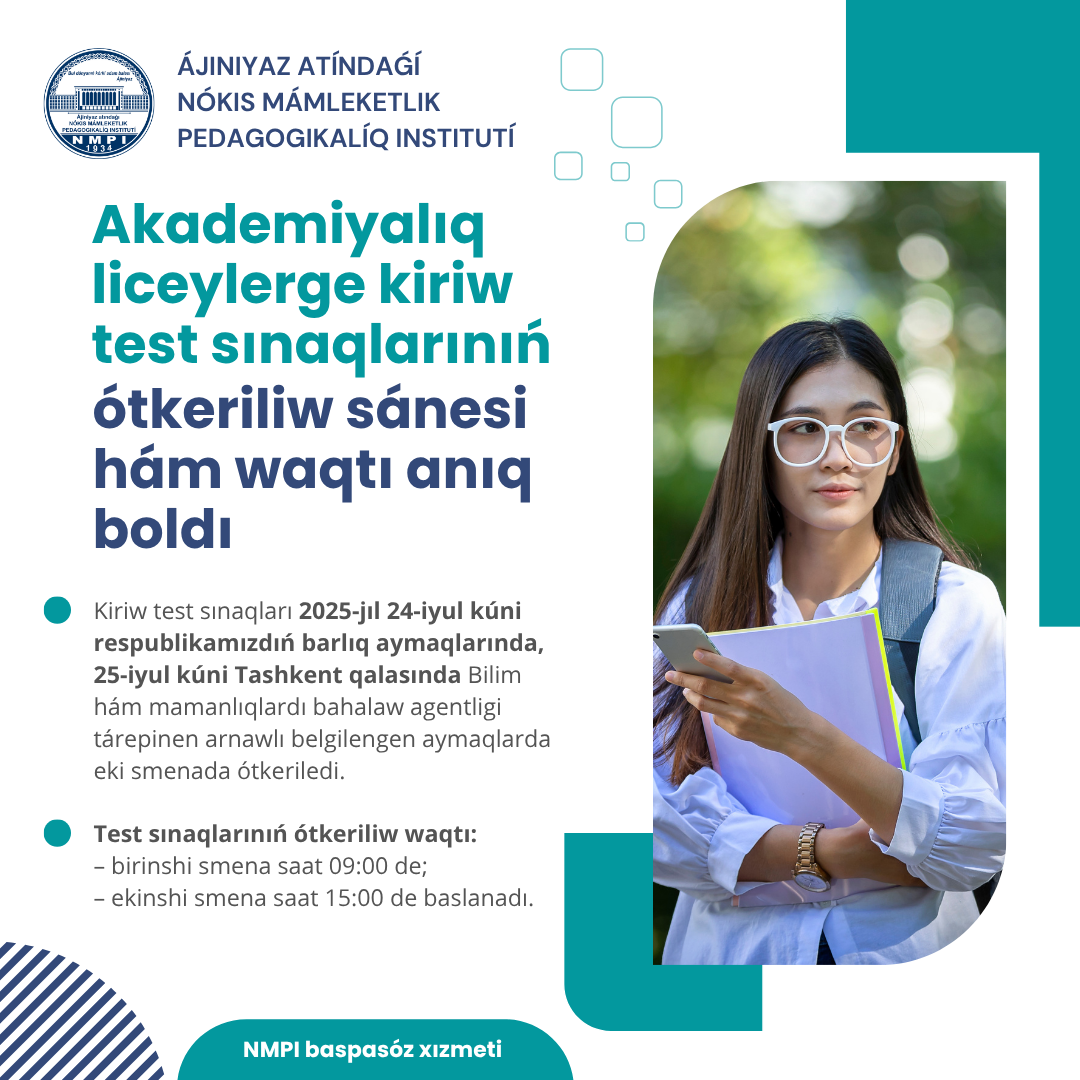 Kiriw test sınaqları 2025-jıl 24-iyul kúni respublikamızdıń barlıq aymaqlarında, 25-iyul kúni Tashkent qalasında Bilim hám mamanlıqlardı bahalaw agentligi tárepinen arnawlı belgilengen aymaqlarda eki smenada ótkeriledi.