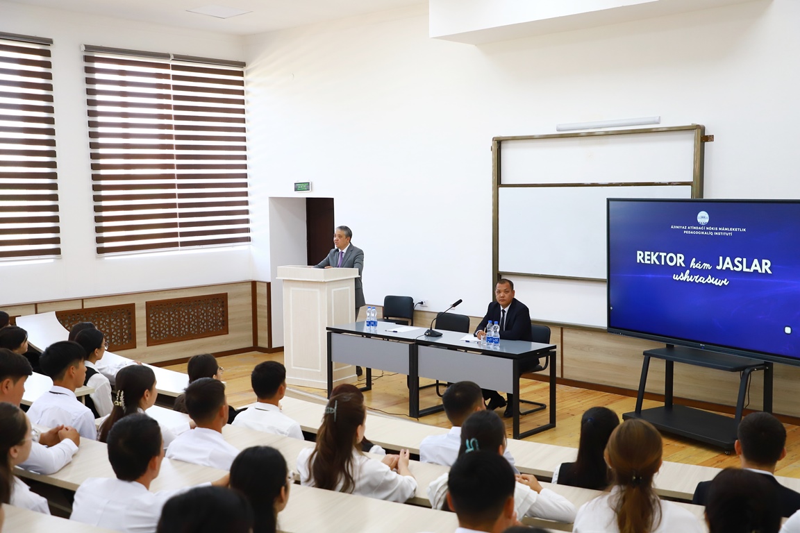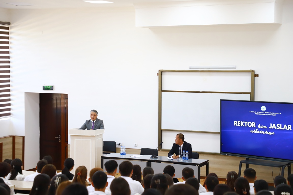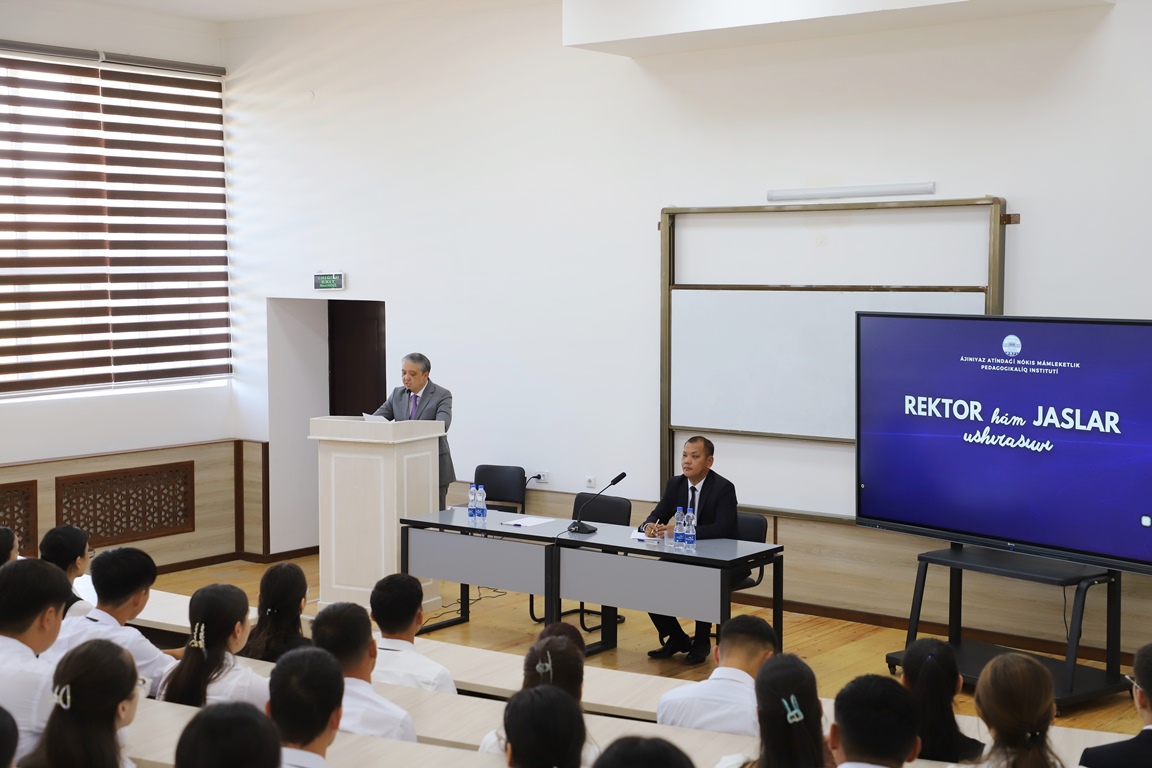 Rektor studentler menen ashıq sáwbetlesiw ótkerip, olarǵa jaratılıp atırǵan sharayatlar, ilimiy hám dóretiwshilik joybarlarda belsene qatnasıw, shet tillerin tereń úyreniw, sonday-aq, kásiplik sheberliklerin arttırıw boyınsha másláhátlerin berdi.