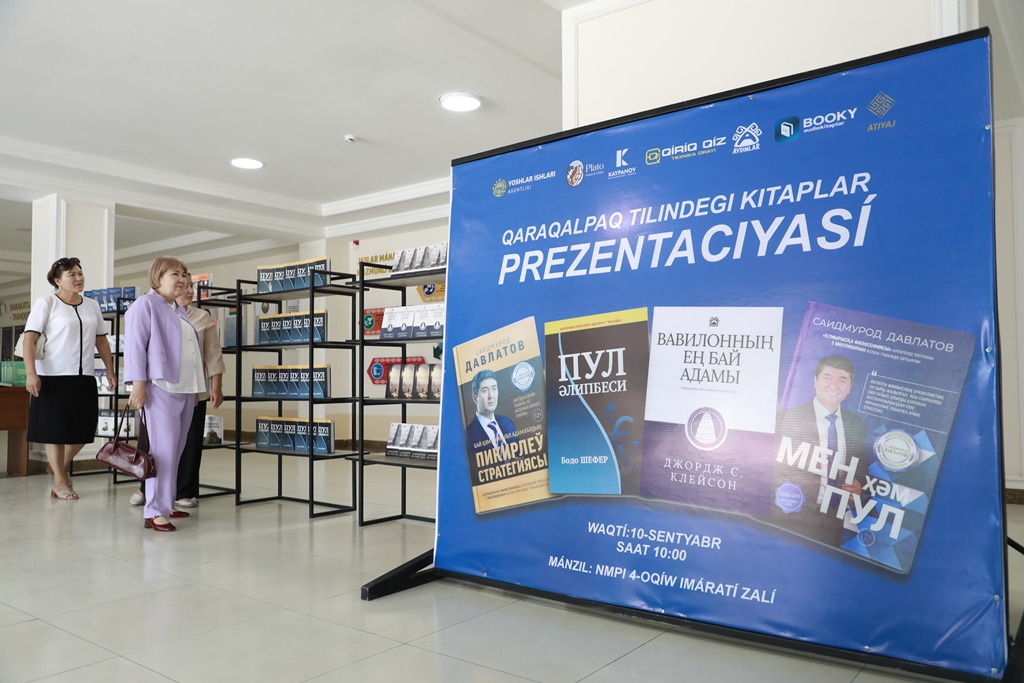 Búgin, 10-sentyabr kúni Ájiniyaz atındaǵı Nókis mámleketlik pedagogikalıq institutında «Plato Books», «Booky», «Atiyaj» juwapkershiligi sheklengen jámiyetleri hám «Aydınlar» joybarı tárepinen finanslıq sawatlılıq boyınsha qaraqalpaq tiline awdarılǵan Bodo Sheferdiń «Pul álipbesi», Jorj S.Kleysonnıń «Vavilonnıń eń bay adamı», Saidmurod Davlatovtıń «Men hám pul» hám «Pikirlew strategiyası» kitapların keń jámiyetshilikke tanıstırıwǵa arnalǵan ilaj bolıp ótti.