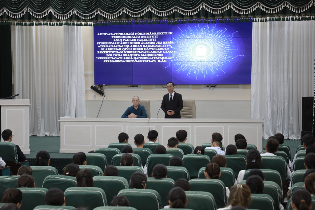 Ájiniyaz atındaǵı Nókis mámleketlik pedagogikalıq institutı Anıq pánler fakultetinde student-jaslardı kiberortalıqta júz berip atırǵan jańalıqlardan xabardar etiw, olardı hár qıylı kiberqáwiplerden qorǵaw hám kiberjınayatlardıń aldın alıw maqsetinde úgit-násiyat ushırasıwı bolıp ótti.