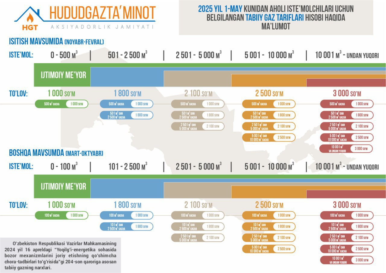 Gúz-qıs máwsiminde tábiyiy gazden paydalanıw joqarı bolǵanlıǵı sebepli Qaraqalpaqstan Respublikası hám Xorezm wálayatında oktyabr-fevral aylarında bir aylıq «bazalıq norma» 500 kub metr ámel etedi.