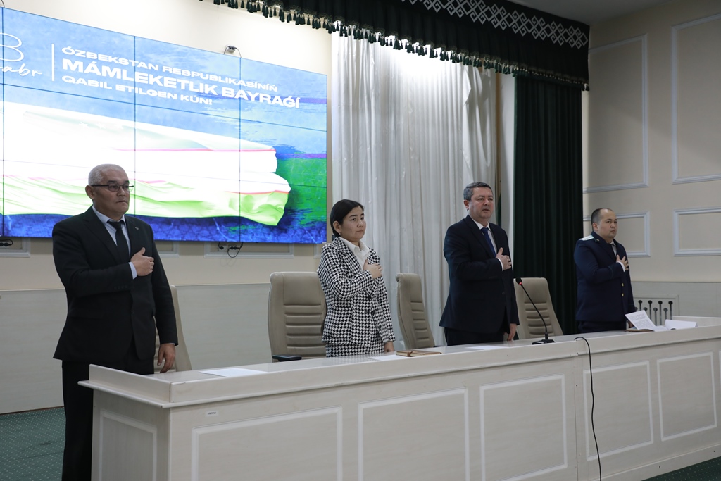 Ilajda sózge shıqqanlar tárepinen atap ótilgenindey, bıyıl mámleketlik suverenitettiń belgilerinen biri bolǵan ǵárezsiz Ózbekstan Respublikasınıń mámleketlik bayraǵınıń qabıl etilgenine 34 jıl tolmaqta. Ózbekstan Respublikası Oliy Kengashiniń 1991-jıl 18-noyabrdegi gezekten tıs VII sessiyasında tastıyıqlanǵan mámleketlik bayraǵı jer júzinde ǵárezsiz Ózbekstan degen mámlekettiń bar ekenligin ańlatadı hám ózinde milliy-mádeniy dástúrlerdi jámleydi.