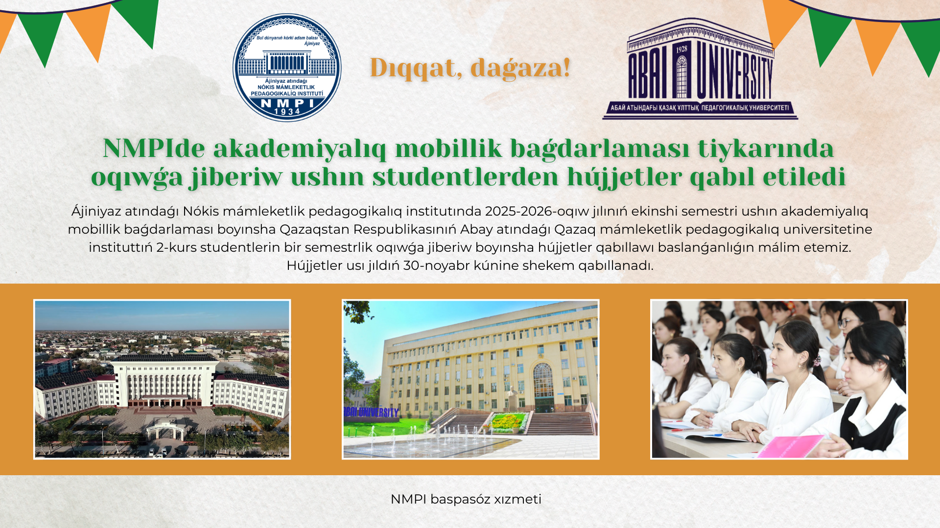 Ájiniyaz atındaǵı Nókis mámleketlik pedagogikalıq institutında 2025-2026-oqıw jılınıń ekinshi semestri ushın akademiyalıq mobillik baǵdarlaması boyınsha Qazaqstan Respublikasınıń Abay atındaǵı Qazaq mámleketlik pedagogikalıq universitetine instituttıń 2-kurs studentlerin bir semestrlik oqıwǵa jiberiw boyınsha hújjetler qabıllawı baslanǵanlıǵın málim etemiz.