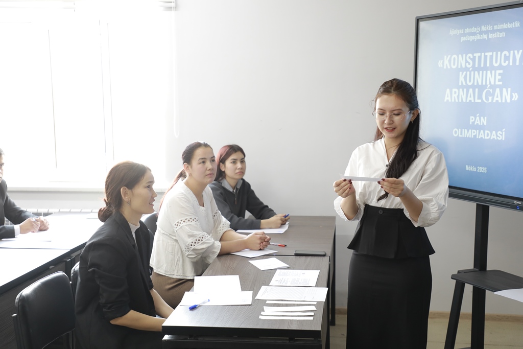 Ájiniyaz atındaǵı Nókis mámleketlik pedagogikalıq institutında student-jaslardıń Ózbekstan Respublikası Konstituciyası, onıń tiykarǵı principleri hám qaǵıydaları boyınsha bilimlerin arttırıwdı xoshametlew, ómirde ózleriniń múnásip orınların tabıwda Bas Nızamımızdıń áhmiyeti hám rolin túsinip alıwına múnásip sharayatlar jaratıw maqsetinde «Konstituciya olimpiadası» ótkerildi.