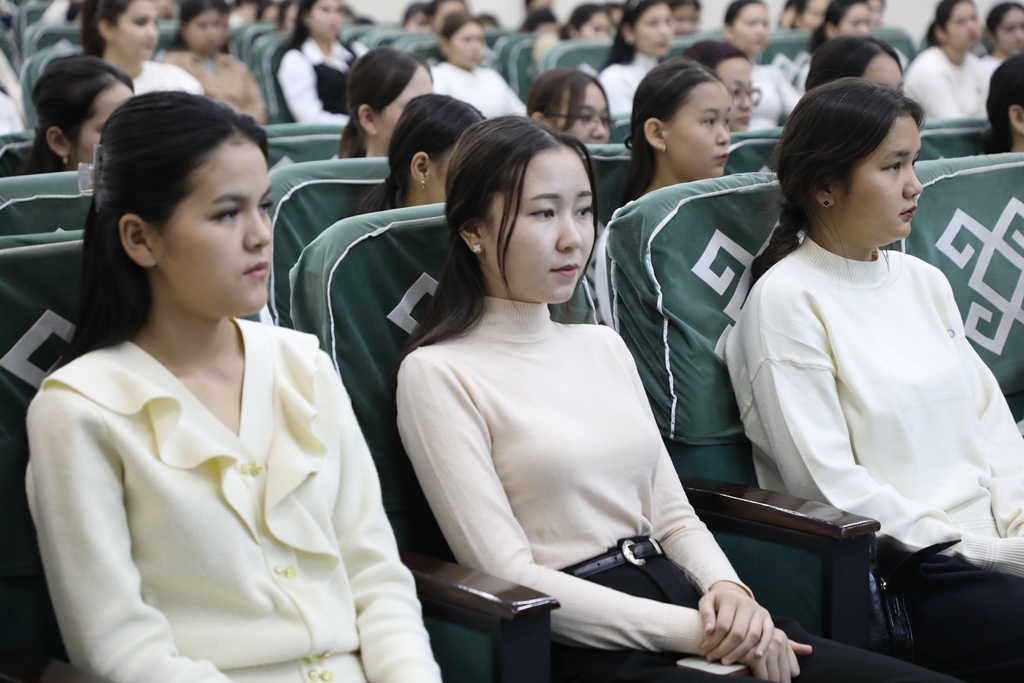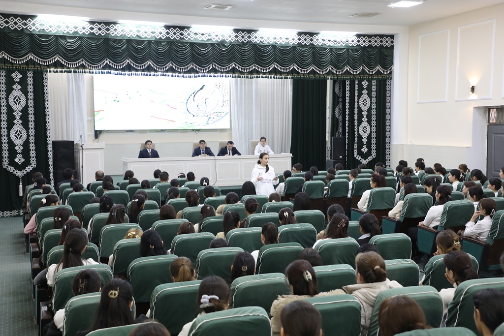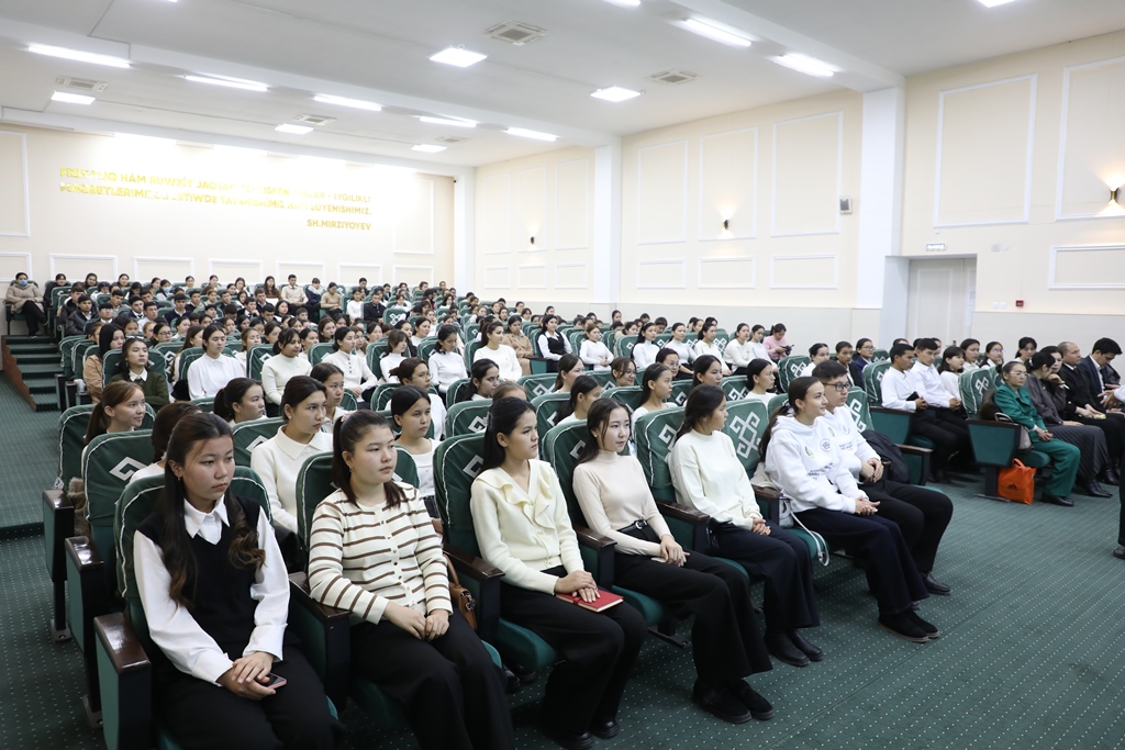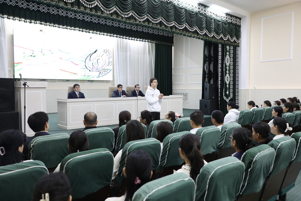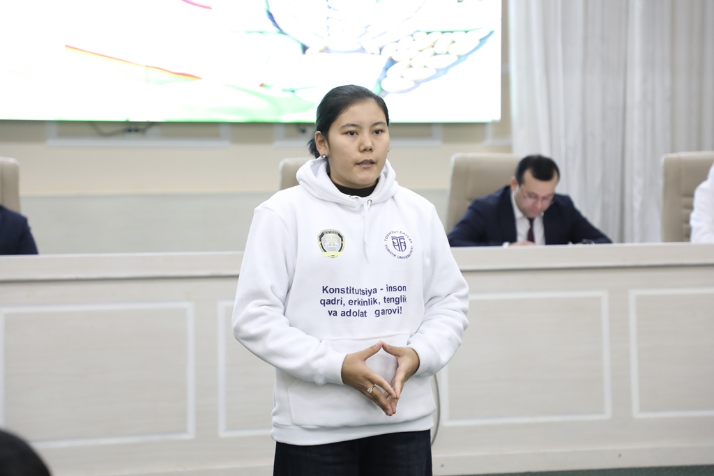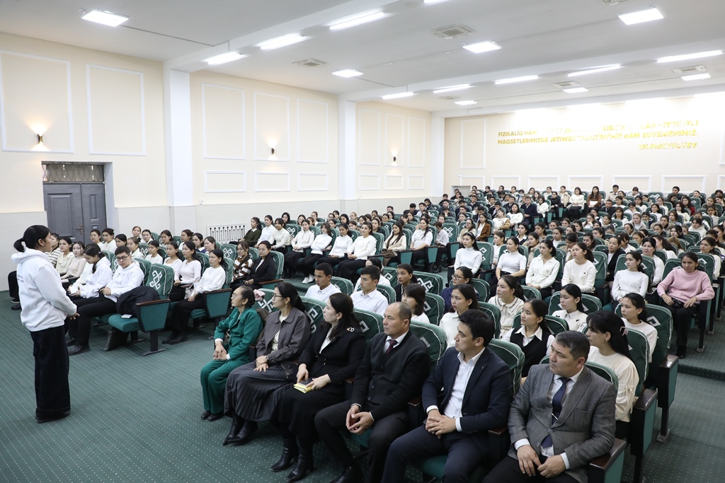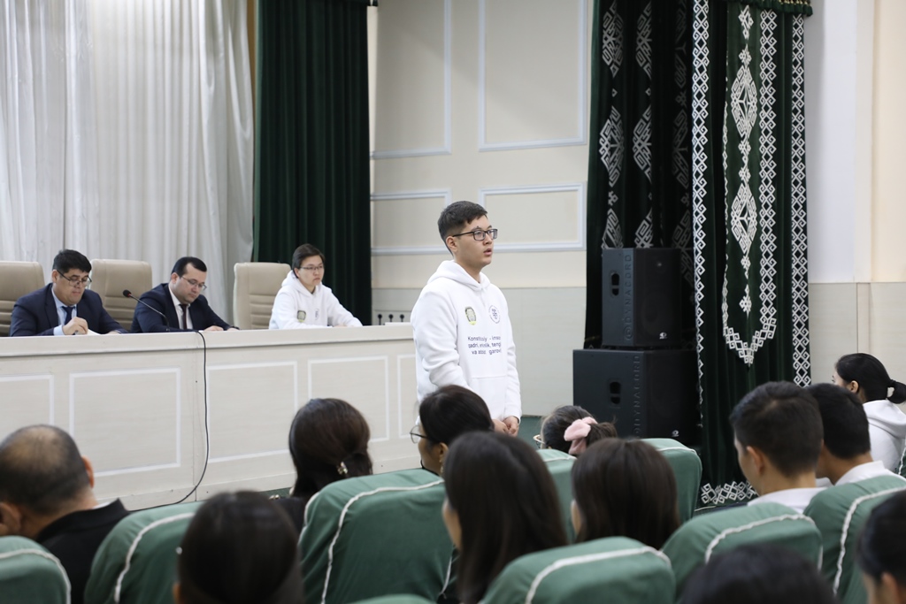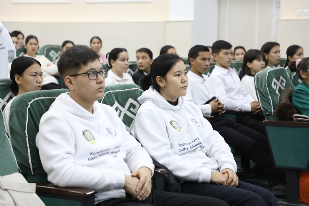 «Konstituciya – insan qádiri, erkinlik, teńlik hám ádillik girewi» súreni tiykarında shólkemlestirilgen ushırasıwǵa instituttıń belsendi student-jasları qatnastı.