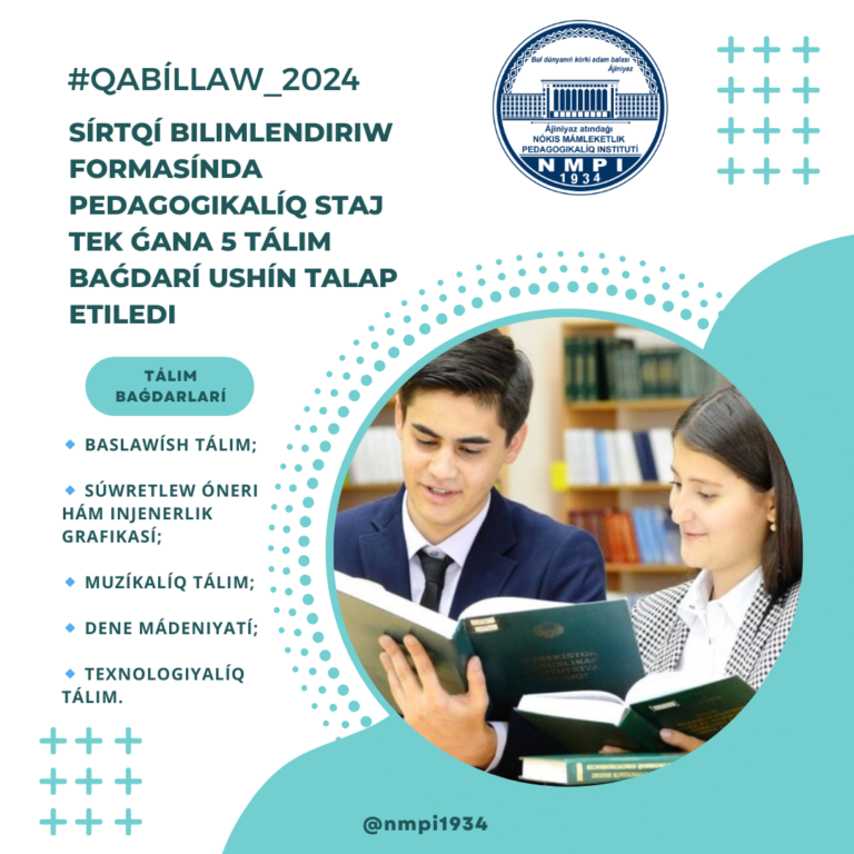 2024-2025-oqıw jılında Ájiniyaz atındaǵı Nókis mámleketlik pedagogikalıq institutı bakalavriatınıń aralıqtan oqıtıw forması boyınsha mámleketlik buyırtpası tiykarında oqıwǵa qabıllaw parametrleriniń tálim baǵdarları hám oqıtıw tilleri boyınsha BÓLISTIRILIWI