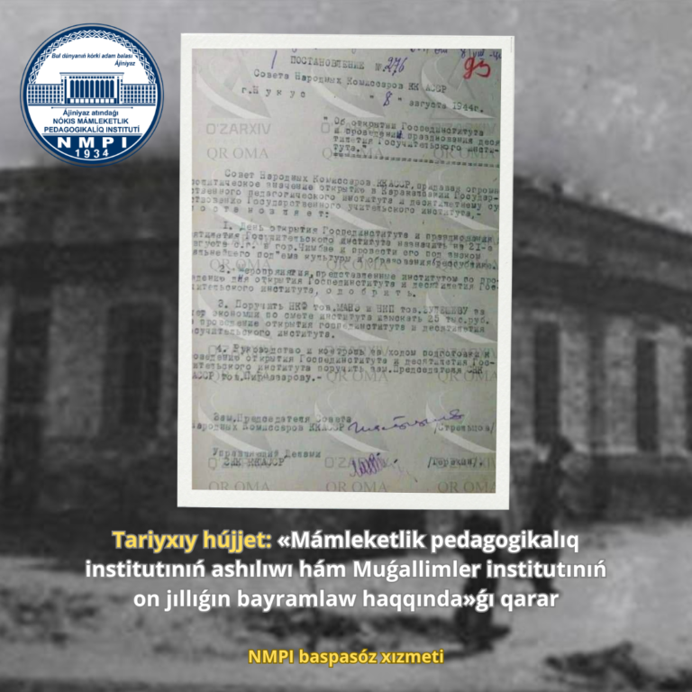 Tariyxıy hújjet: «Mámleketlik pedagogikalıq institutınıń ashılıwı hám Muǵallimler institutınıń on jıllıǵın bayramlaw haqqında»ǵı qarar