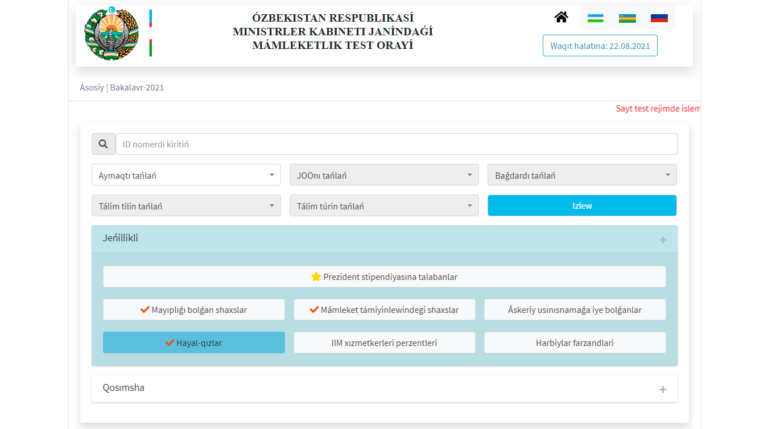 Jeńilliklerge iye abiturientler haqqındaǵı maǵlıwmatlar «Mandat.dtm.uz» saytına ornalastırıldı