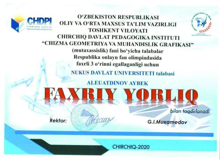 Хош хабар! Институтымыз студенти Әдилбек Бахтыбаев халықаралық дөретиўшилик онлайн таңлаў-фестивалында I дәрежели диплом менен сыйлықланды