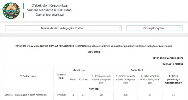 Қарақалпақстандағы жоқары оқыў орынларына 2991 абитуриенттен арза келип түсти: жоқары оқыў орынлары кесиминде