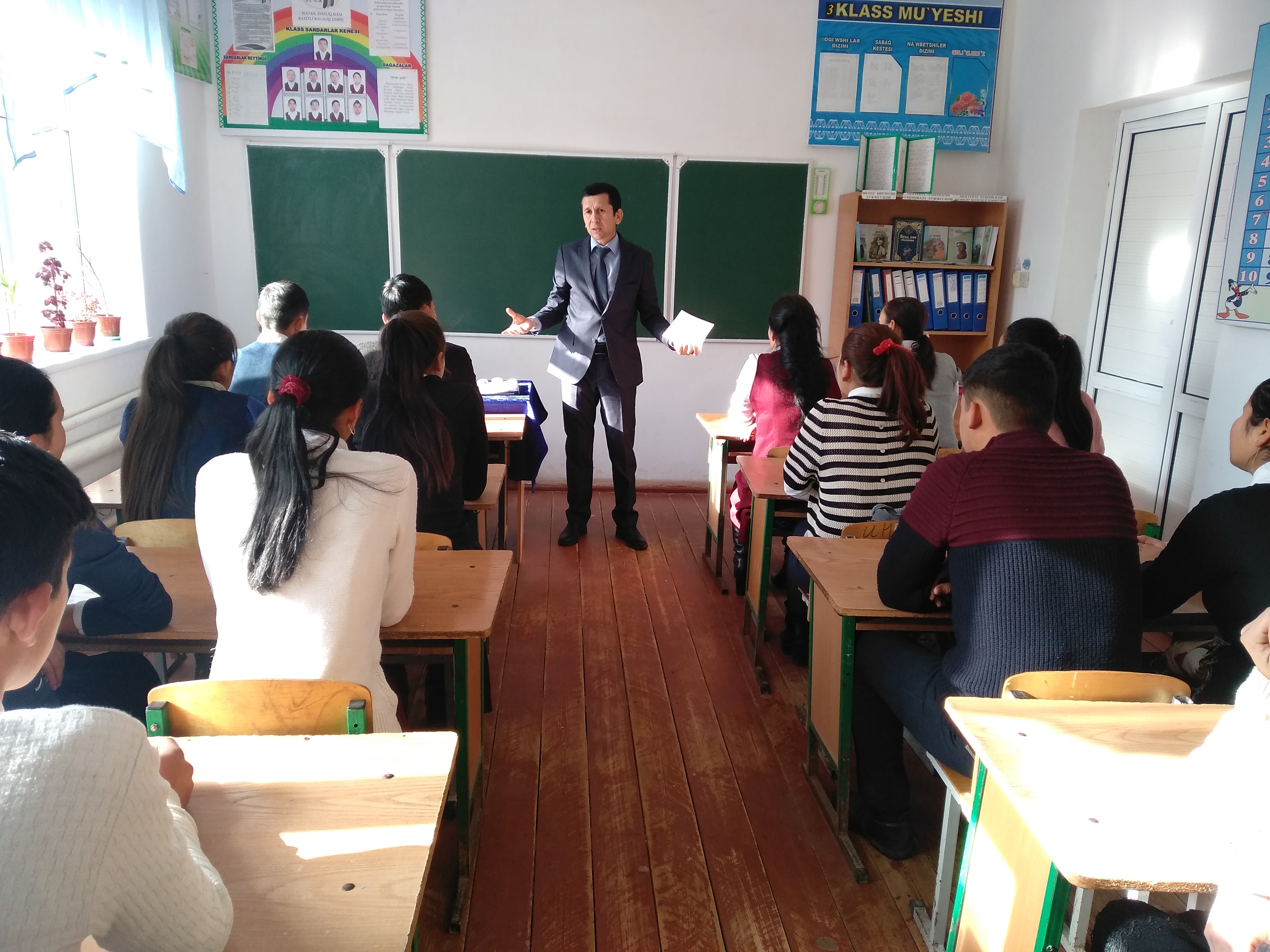 Мактабларда ўтказилган “Ўқувчиларни китобхонликка жалб этиш ва касбга йўналтириш” мавзусида мактаб ўқитувчилари ва 10-11-синф ўқувчилари иштирокида ўтказилган тадбирда Ўзбек адабиёти кафедраси мудири С.Матякупов Ўзбекистон Республикаси Президентининг 2017 йил 13 сентябрдаги “Китоб маҳсулотларини нашр этиш ва тарқатиш тизимини ривожлантириш, китоб мутолааси ва китобхонлик маданиятини ошириш ҳамда тарғиб қилиш бўйича комплекс чора-тадбирлар дастури тўғрисида”ги ПҚ-3271-сонли қарорида белгиланган вазифалар ижроси хусусида кенг ахборот берди.