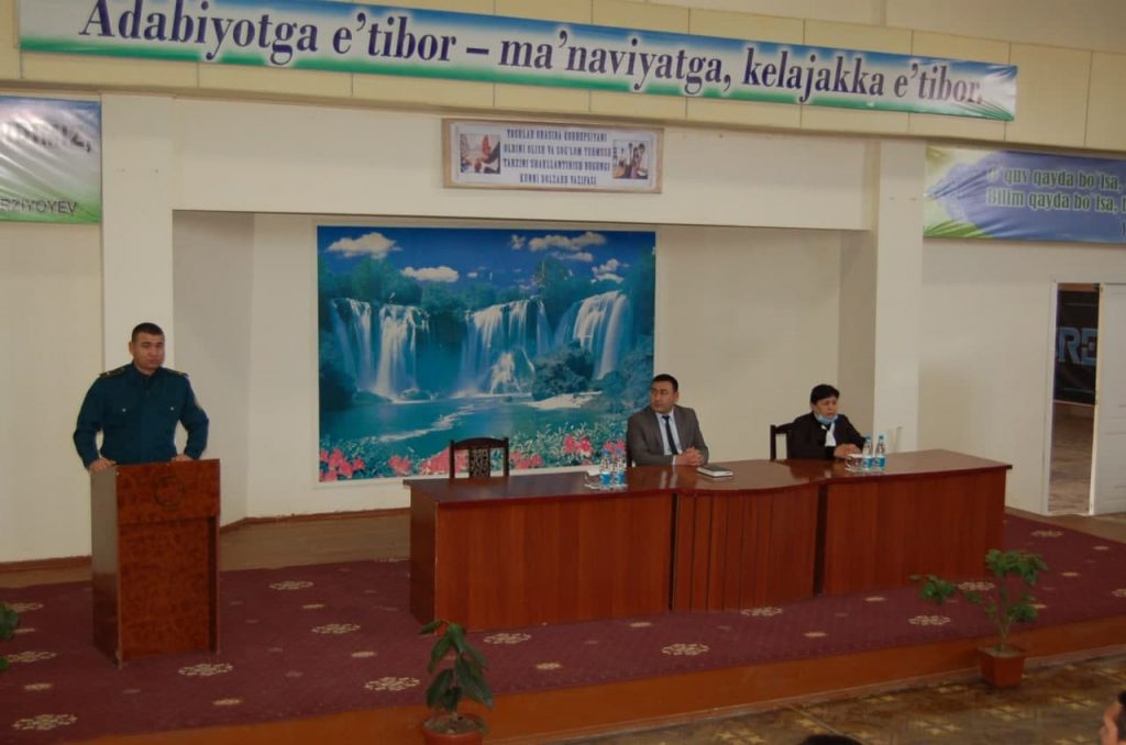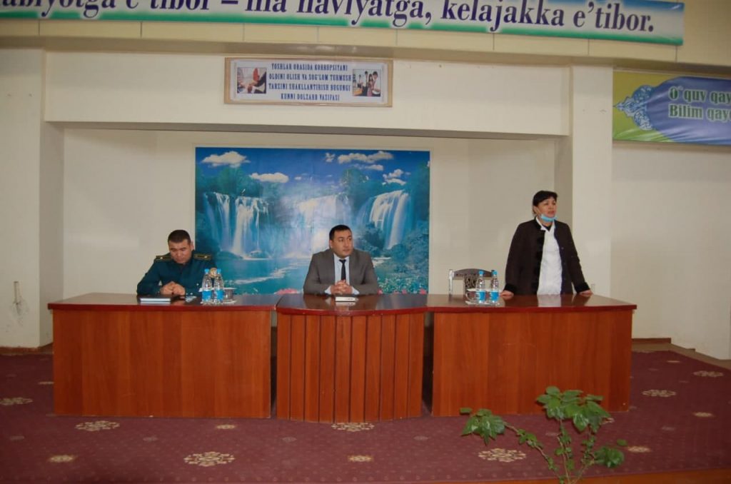 Йиғилишда ИИБ ходими томонидан тингловчиларга 31.12.2020 йилдаги «Коррупцияга оид ҳуқуқбузарлик ҳақида хабар берган ёки коррупцияга қарши курашишга бошқа тарзда кўмаклашган шахсларни рағбатлантириш тартиби тўғрисида»ги ҳукумат қарори билан низом тасдиқланганлигини, низомга мувофиқ коррупцияга оид ҳуқуқбузарлик ҳақида хабар берган ёки коррупцияга қарши курашишга бошқа тарзда кўмаклашган шахслар тегишлича БҲМнинг 3 бараваридан 25 бараваригача (669 минг сўмдан 5 млн 575 минг сўмгача) миқдорда бир марталик пул мукофоти билан рағбатлантирилиши мумкинлиги белгиланганлигини, шунингдек, 2017 йил январдан кучга кирган «Коррупцияга қарши кураш тўғрисида»ги Қонун, 2017 йил 2 февралдаги «Коррупцияга қарши курашиш тўғрисида»ги Ўзбекистон Республикаси Қонунининг қоидаларини амалга ошириш чора-тадбирлари тўғрисида»ги 2752-сонли Президент қарори, 2019 йил 27 майдаги «Ўзбекистон Республикасида коррупцияга қарши курашиш тизимини янада такомиллаштириш чора-тадбирлари тўғрисида»ги 5729-сонли Президент фармони каби меъёрий ҳуқуқий ҳужжатлар қабул қилинганлигини, 5729-сонли Президент фармони билан «2019-2020 йилларда коррупцияга қарши курашиш Давлат дастури» ишлаб чиқилганлигини ва уларда белгиланган вазифалар хақида айтиб ўтди.