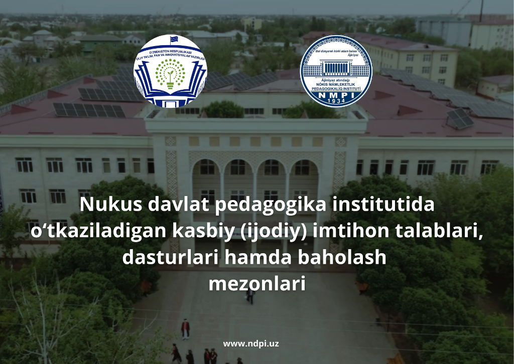 🏛 Nukus davlat pedagogika institutida oʻtkaziladigan kasbiy (ijodiy) imtihon talablari, dasturlari hamda baholash mezonlari bilan tanishing (bakalavriatning kundizgi va sirtqi ta’lim yoʻnalishlari uchun).