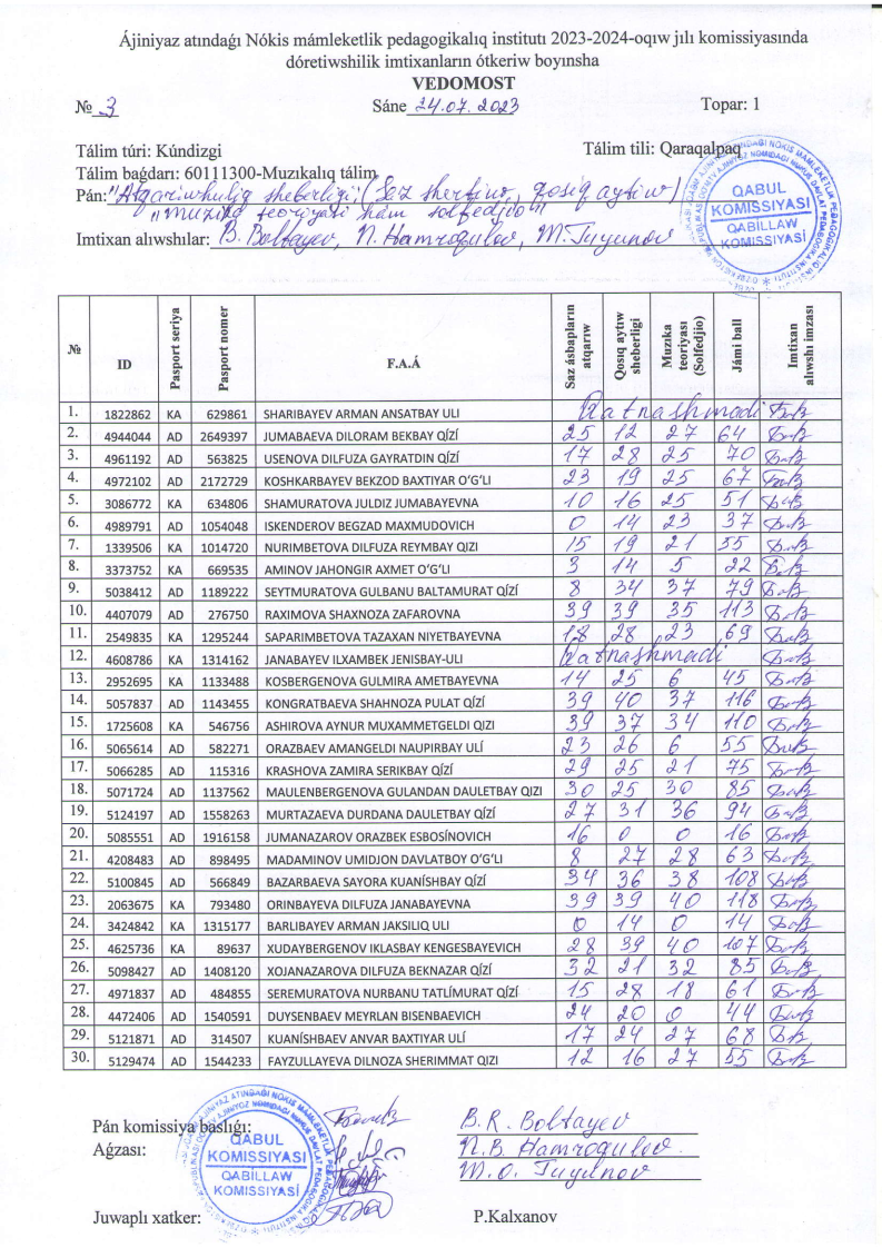 24-iyul kuni musiqa ta’limi yoʻnalishining kunduzgi qoraqalpoq guruhiga oʻtkazilgan kasbiy (ijodiy) imtihonlarning natijalari
