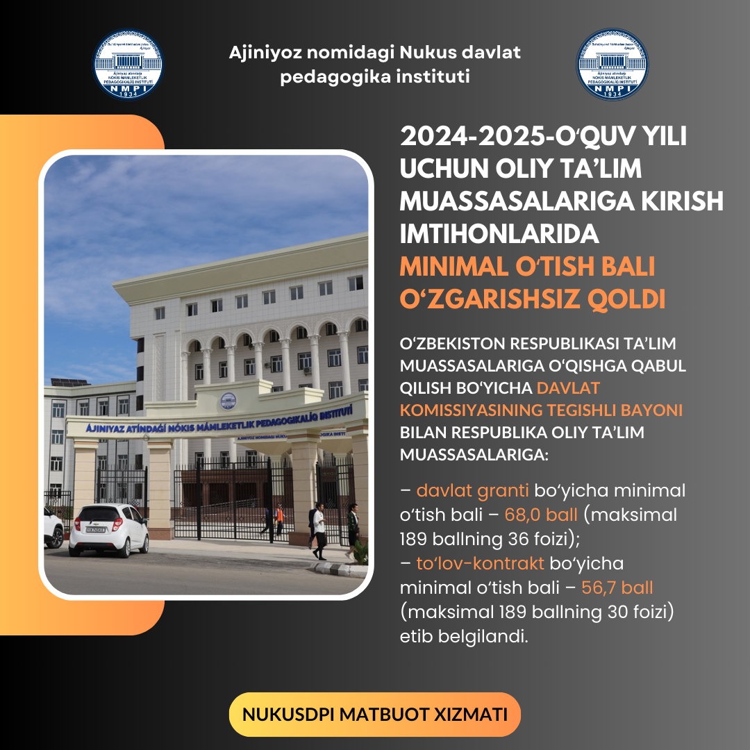 2024-2025-oʻquv yili uchun oliy ta’lim muassasalariga kirish imtihonlarida minimal oʻtish bali o‘zgarishsiz qoldi