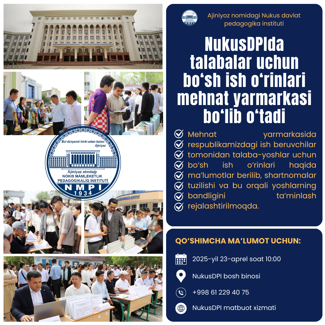 Shu yilning 23-aprel kuni soat 10:00 da Ajiniyoz nomidagi Nukus davlat pedagogika institutida talabalarning bandligini ta’minlash maqsadida bo‘sh ish o‘rinlari mehnat yarmarkasi bo‘lib o‘tadi.