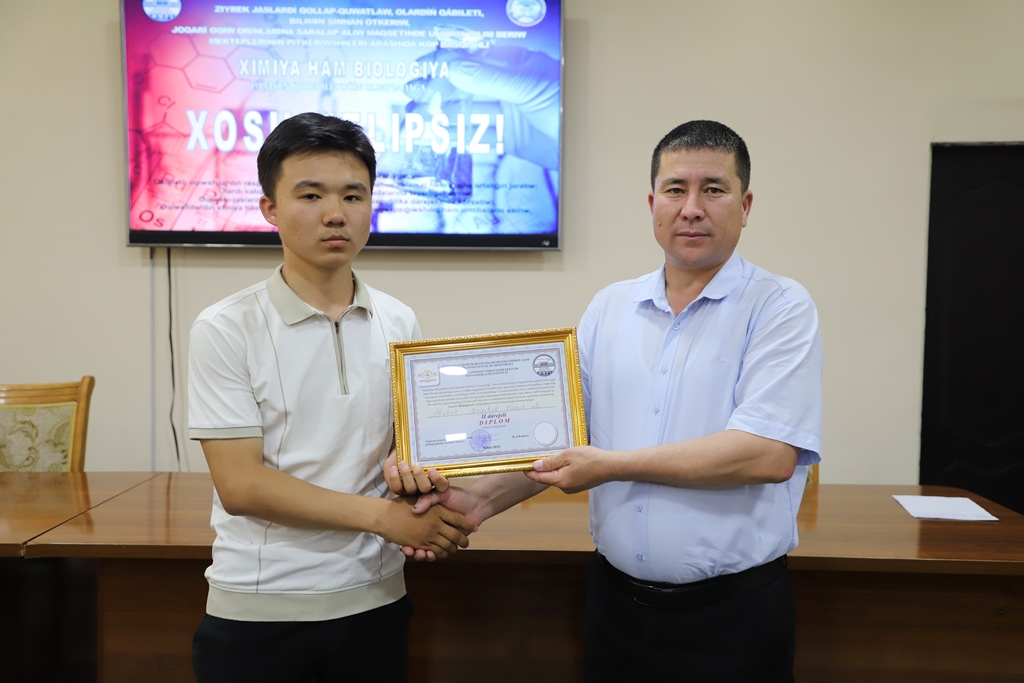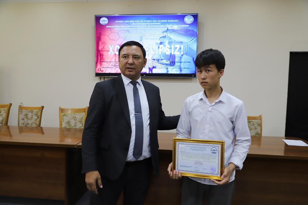 O‘zbekiston Respublikasi Prezidentining “Kimyo va biologiya yo‘nalishlarida uzluksiz ta’lim sifatini va ilm-fan natijadorligini oshirish chora-tadbirlari to‘g‘risida”gi qarori asosida o‘tkazilgan olimpiadada dastlab tuman, so‘ngra Qoraqalpog‘iston Respublikasi bosqichida yuqori natijalarga erishgan 10 nafar o‘quvchi ishtirok etdi.