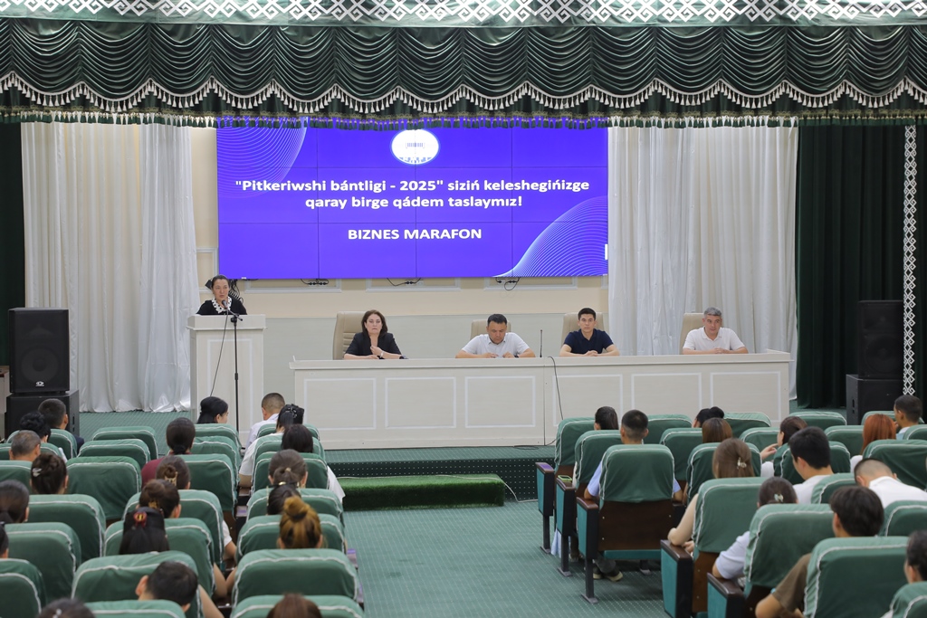 Ajiniyoz nomidagi Nukus davlat pedagogika institutida bitiruvchi talabalarning mehnat bozoriga samarali kirib borishini qo‘llab-quvvatlash, ularning bandligini ta’minlash, shuningdek, yoshlarning tadbirkorlik salohiyatini rivojlantirish maqsadida “Bitiruvchi bandligi – 2025” loyihasi doirasida “Karyera kuni” mehnat yarmarkasi va “Biznes marafon” seminar-treningi tashkil etildi.
