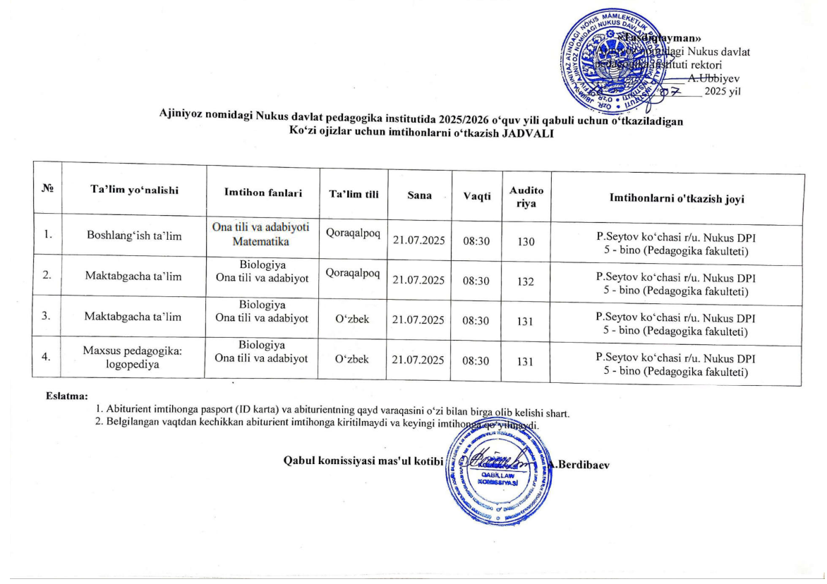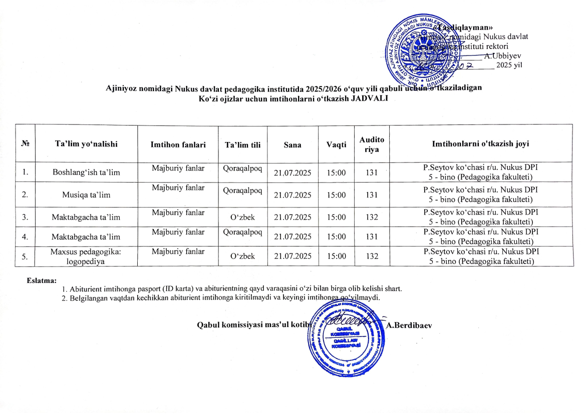 Ajiniyoz nomidagi Nukus davlat pedagogika institutida 2025-2026-o‘quv yiliga qabul jarayonida ko‘zi ojiz abituriyentlar uchun o‘tkaziladigan imtihonlar jadvali tasdiqlandi.