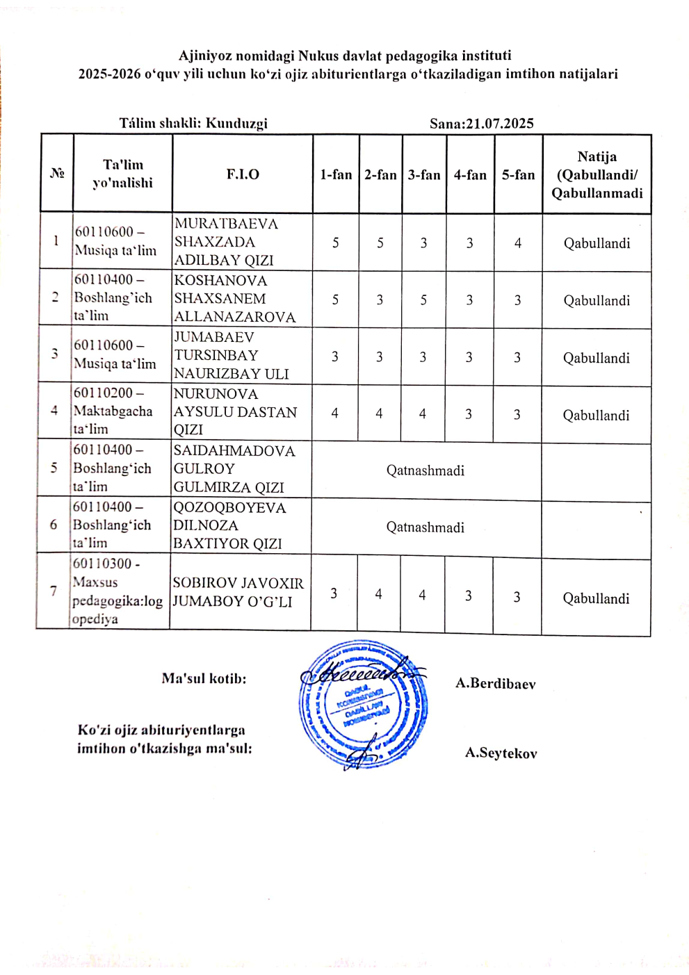 Ajiniyoz nomidagi Nukus davlat pedagogika institutida 2025-2026-o‘quv yiliga qabul jarayonida ko‘zi ojiz abituriyentlar uchun o‘tkazilgan imtihonlar natijasi e’lon qilindi.