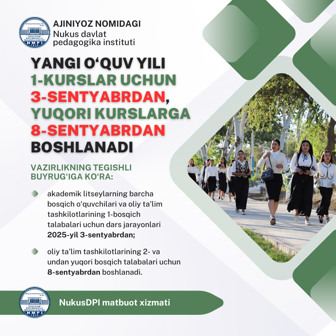 Yangi o‘quv yili 1-kurslar uchun 3-sentyabrdan, yuqori kurslarga 8-sentyabrdan boshlanadi