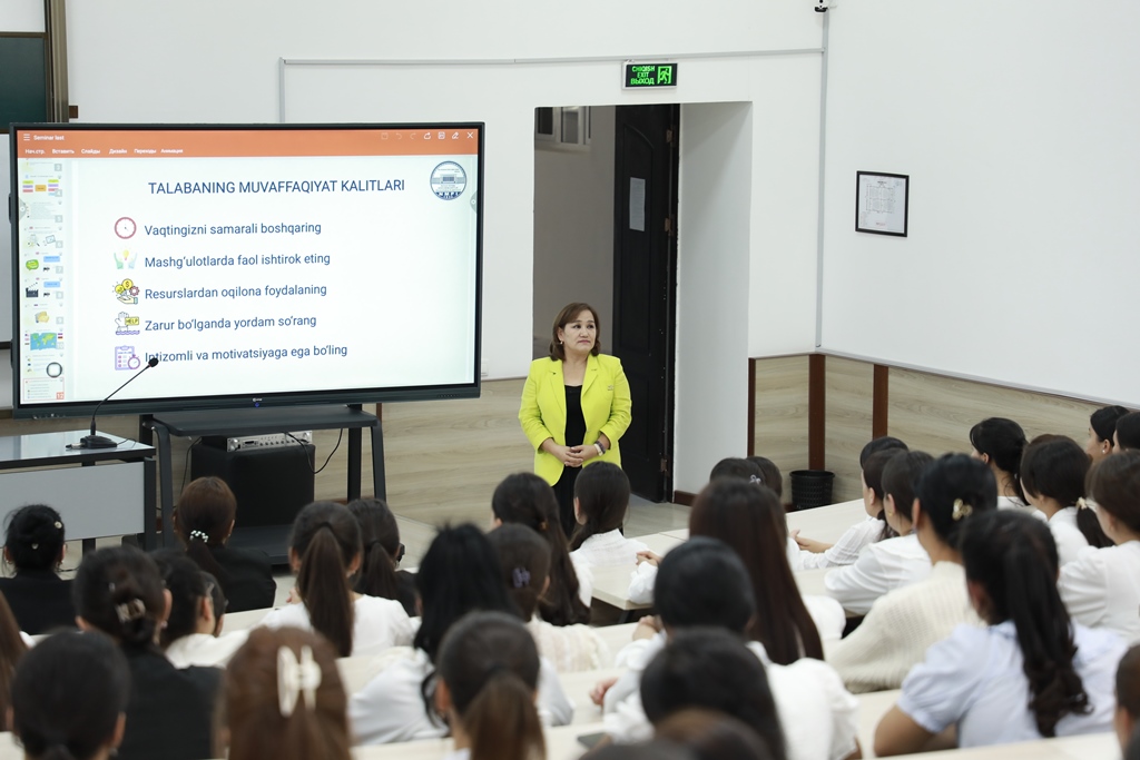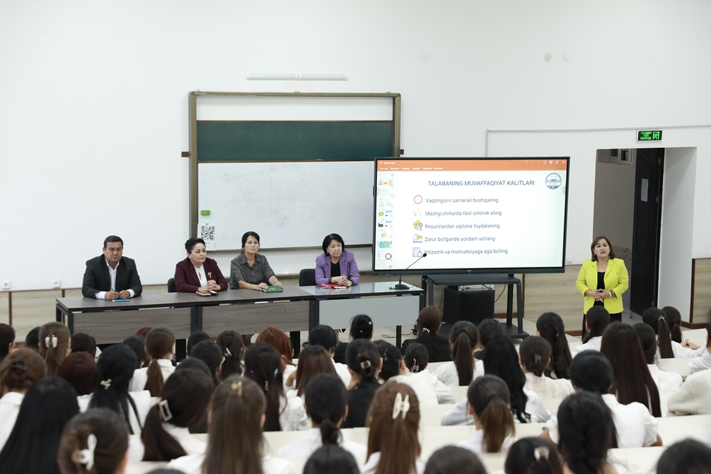 Uchrashuvda fakultet dekani Gulbahar Begmuratova talabalar uchun yaratilgan sharoitlar, o‘quv jarayonining samaradorligini oshirish, bo‘sh vaqtlarini mazmunli o‘tkazish va ularni turli to‘garaklar hamda ilmiy loyihalarga jalb etish masalalari bo‘yicha taqdimot qildi.