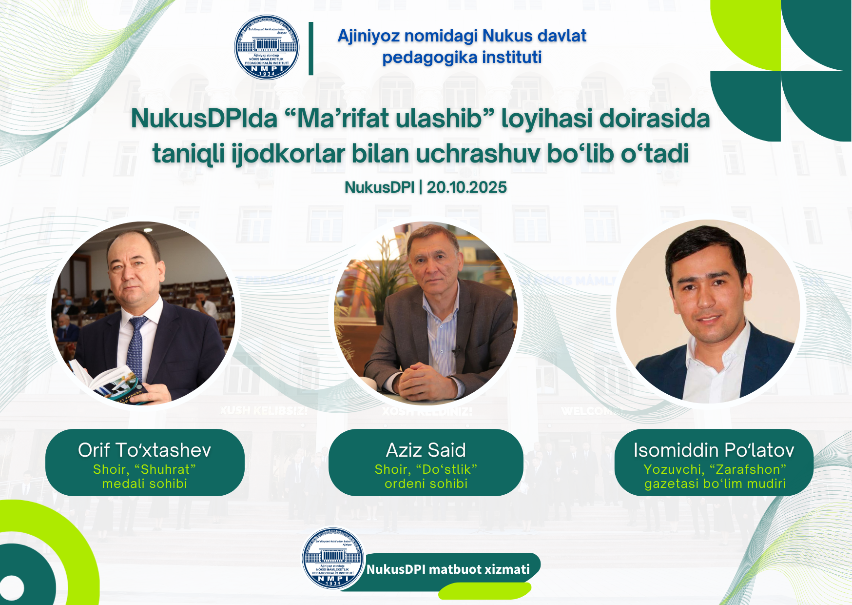 Joriy yilning 20-oktyabr kuni Ajiniyoz nomidagi Nukus davlat pedagogika institutida “Ma’rifat ulashib” loyihasi doirasida O‘zbekiston Yozuvchilar uyushmasi huzuridagi “Bolalar va o‘smirlar adabiyoti” Kengashi raisi, taniqli shoir, “Shuhrat” medali sohibi Orif To‘xtashev, “Sharq yulduzi” jurnali bosh muharriri o‘rinbosari, taniqli shoir, “Do‘stlik” ordeni sohibi Aziz Said, “Zarafshon” gazetasi bo‘lim boshlig‘i, taniqli yozuvchi Isomiddin Po‘latovlar bilan uchrashuv, shuningdek, adabiy kecha va madaniy-ma’rifiy tadbirlar bo‘lib o‘tadi.