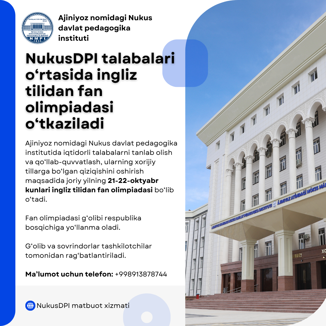 Ajiniyoz nomidagi Nukus davlat pedagogika institutida iqtidorli talabalarni tanlab olish va qo‘llab-quvvatlash, ularning xorijiy tillarga bo‘lgan qiziqishini oshirish maqsadida joriy yilning 21-22-oktyabr kunlari ingliz tilidan fan olimpiadasi bo‘lib o‘tadi.