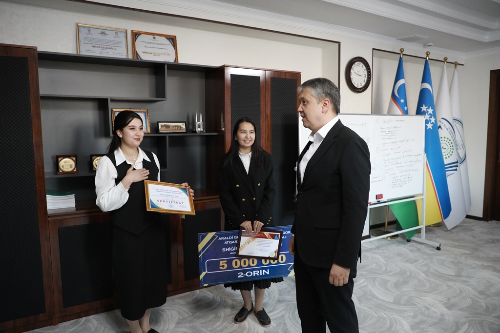 Shuningdek, ushbu tanlovda Tabiiy fanlar fakulteti kimyo ta’lim yo‘nalishining 2-kurs talabasi Maftuna Jumaboyeva maishiy va qishloq xo‘jaligi chiqindilarini qayta ishlash orqali ekologik toza yoqilg‘i (briket, pelet) va organik o‘g‘itlar ishlab chiqarish bo‘yicha “EcoLife” loyihasi bilan qatnashib, sertifikat bilan taqdirlandi.