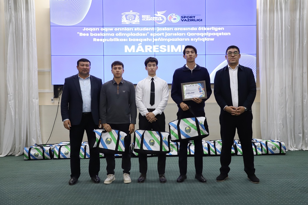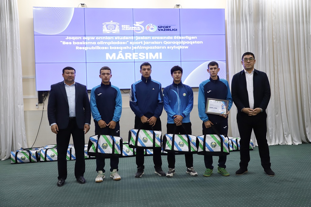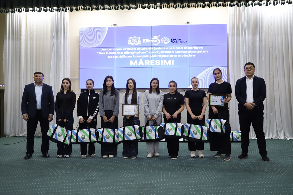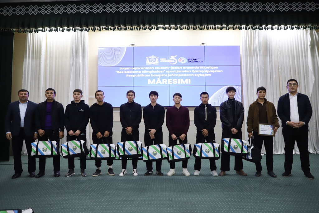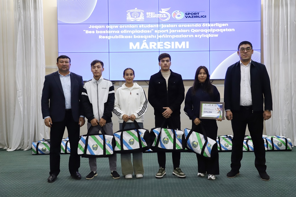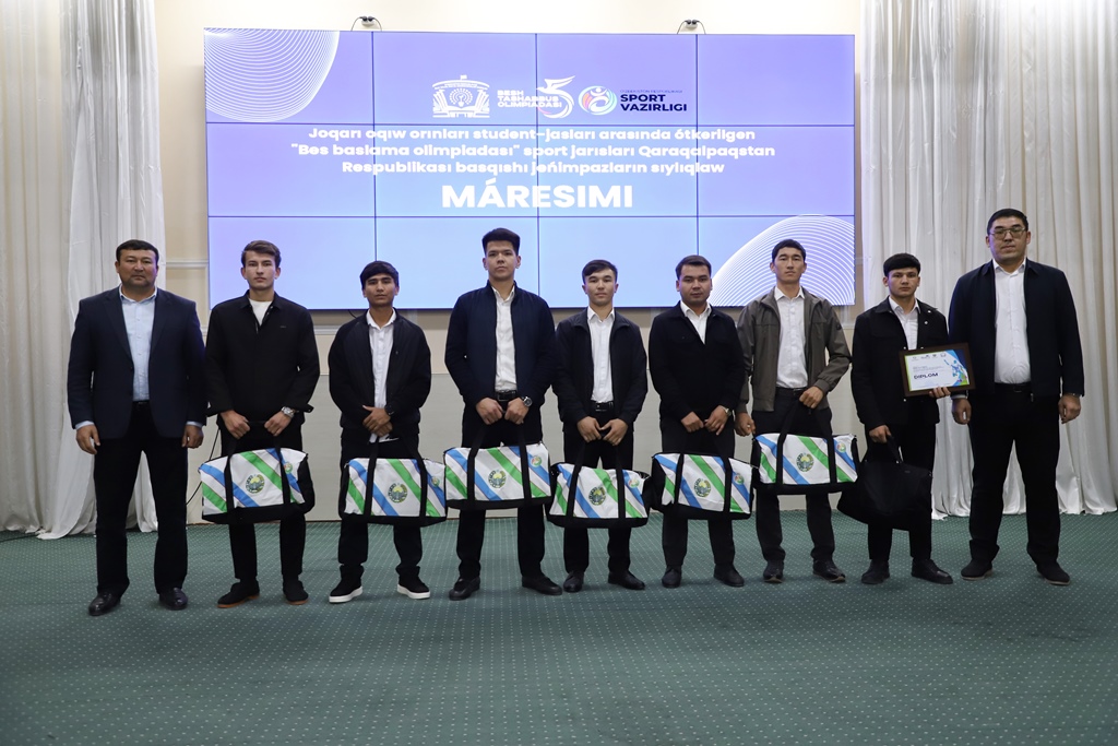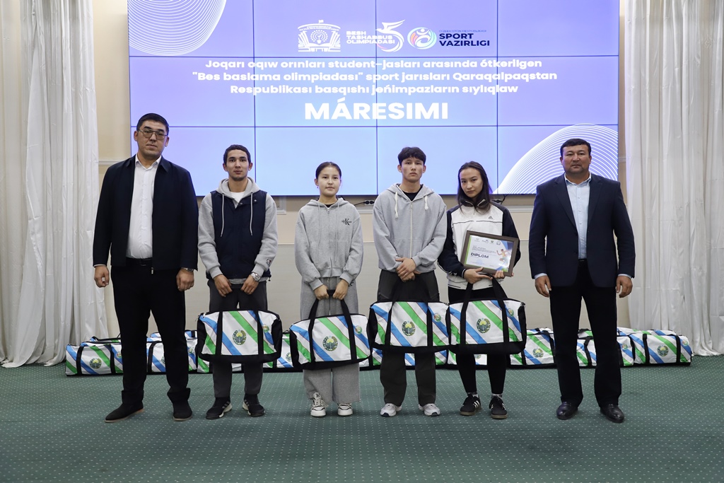Bugun, 12-noyabr kuni Ajiniyoz nomidagi Nukus davlat pedagogika institutida Qoraqalpog‘iston Respublikasi Sport vazirligi, shuningdek, Oliy ta’lim, fan va innovatsiyalar vazirligi tomonidan oliy ta’lim muassasalari talabalari o‘rtasida o‘tkazilgan “Besh tashabbus olimpiadasi” sport musobaqalarining Qoraqalpog‘iston Respublikasi bosqichi g‘oliblarini taqdirlash marosimi bo‘lib o‘tdi.