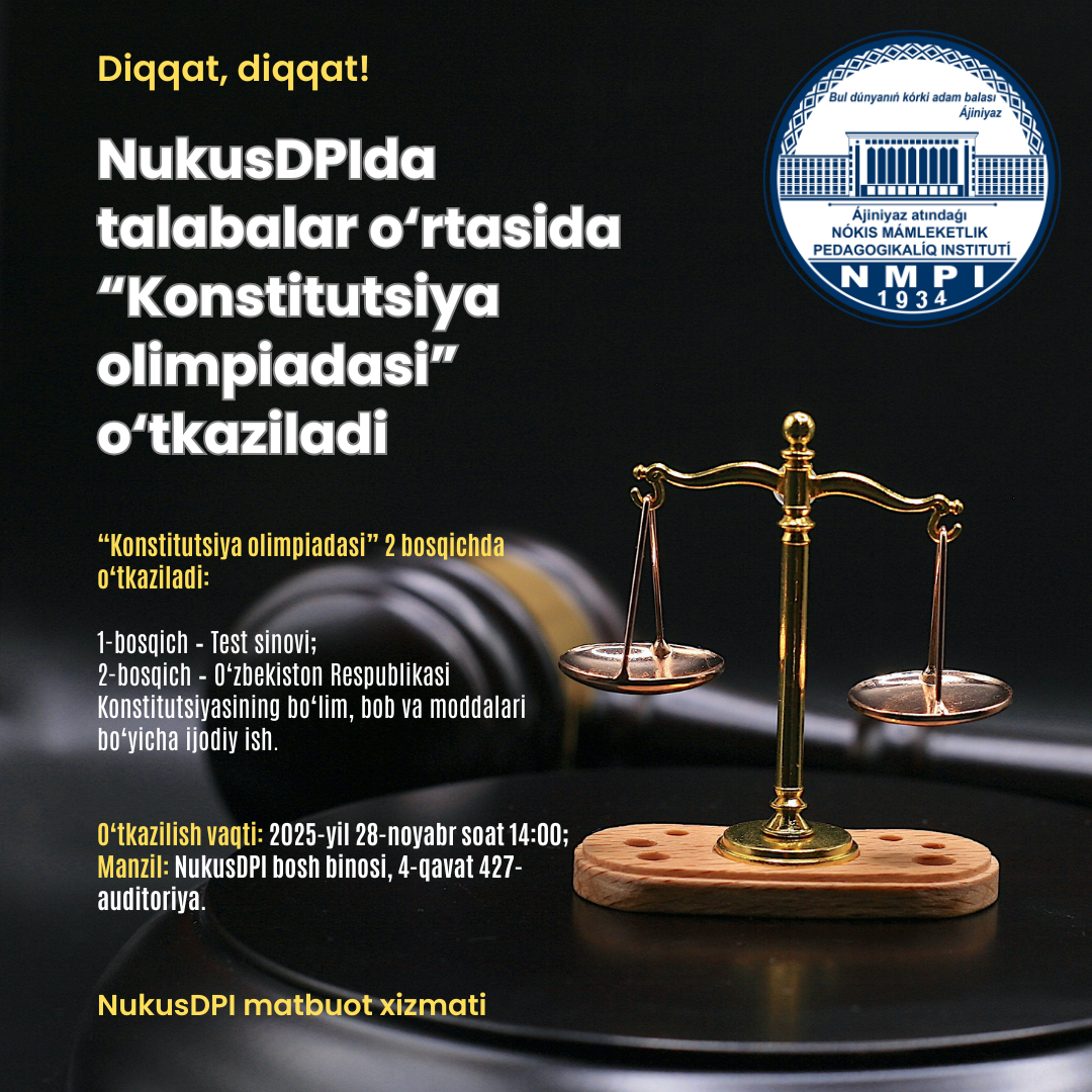 Ajiniyoz nomidagi Nukus davlat pedagogika institutida talaba-yoshlarning O‘zbekiston Respublikasi Konstitutsiyasi, uning asosiy prinsiplari va qoidalari bo‘yicha bilimlarini oshirishni rag‘batlantirish, hayotda o‘zlarining munosib o‘rinlarini topishda Bosh Qomusimizning ahamiyati va rolini tushunib olishlariga munosib sharoitlar yaratish maqsadida joriy yilning 28-noyabr kuni “Konstitutsiya olimpiadasi” o‘tkazilishini e’lon qilamiz.