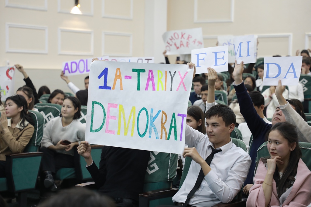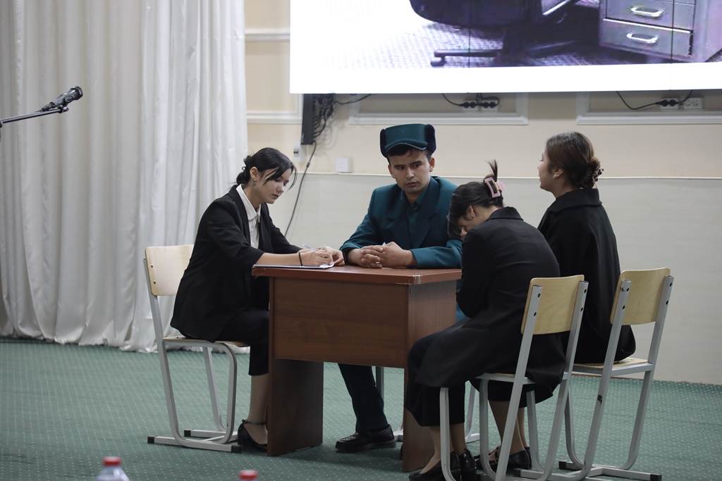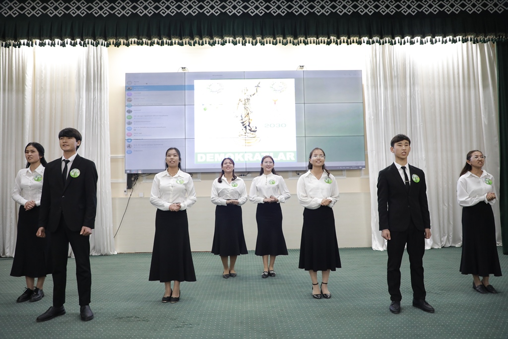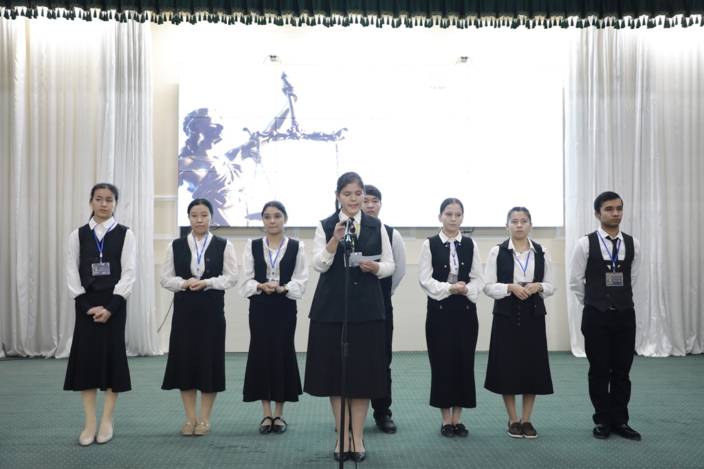 Mamlakatimizda amalga oshirilayotgan keng ko‘lamli islohotlarda talaba-yoshlarning faol ishtirokini ta’minlash, yuksak ma’naviyatli, huquqiy savodxon, mustaqil fikrlaydigan yoshlarni tarbiyalash, insoniyatga yot illatlarga qarshi kurashish immunitetini shakllantirish, bo‘sh vaqtlarini mazmunli o‘tkazish, shuningdek, yoshlarning yangilangan Konstitutsiya bo‘yicha bilimlarini baholash va rag‘batlantirish maqsadida tashkil etilgan tanlovda “Yosh demokratlar”, “Yosh progresslar”, “Adolat”, “Yustitsiya”, “Femida”, “Demokratlar”, “Turon” jamoalari salomnoma, savol-javob va sahna ko‘rinishi kabi shartlar bo‘yicha o‘zlarining konstitutsiyaviy bilim va ko‘nikmalarini sinovdan o‘tkazdi.