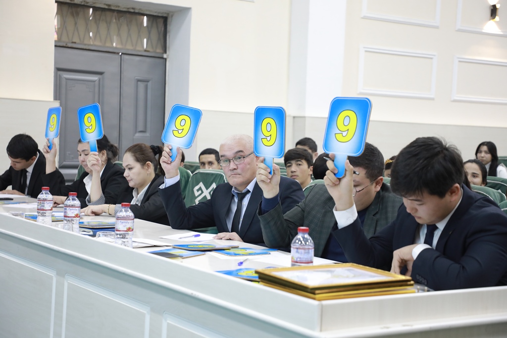 Jamoalarning har bir shart bo‘yicha sahna chiqishlarini, savollarga bergan javoblarini hakamlar hay’ati a’zolari baholab bordi.