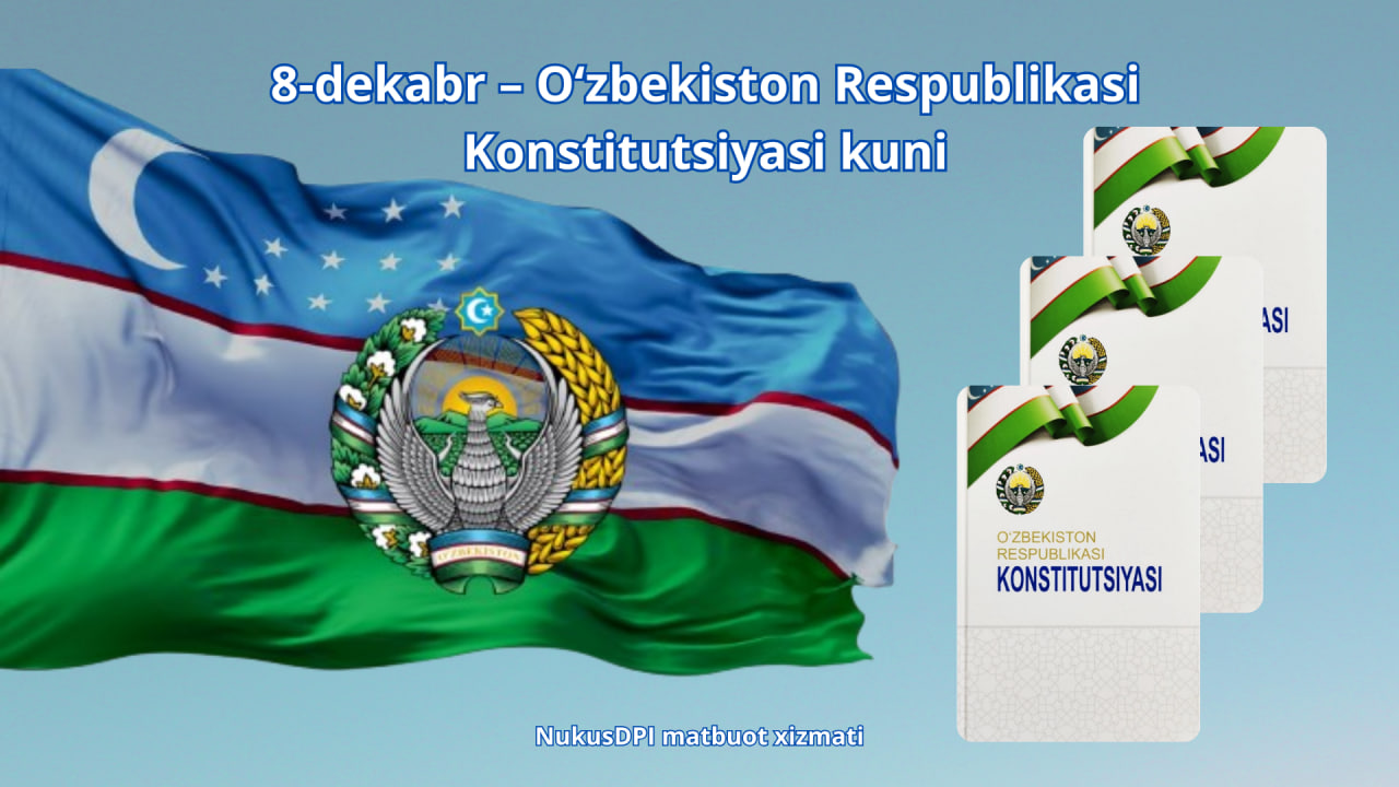 Ko‘p millatli O‘zbekiston va Qoraqalpog‘istonimizning rivojlanish yo‘nalishlarini belgilab beradigan, xalqimizning farovon hayotining kafolati hisoblangan Bosh Qomusimizning 33 yilligi qutlug‘ bo‘lsin!