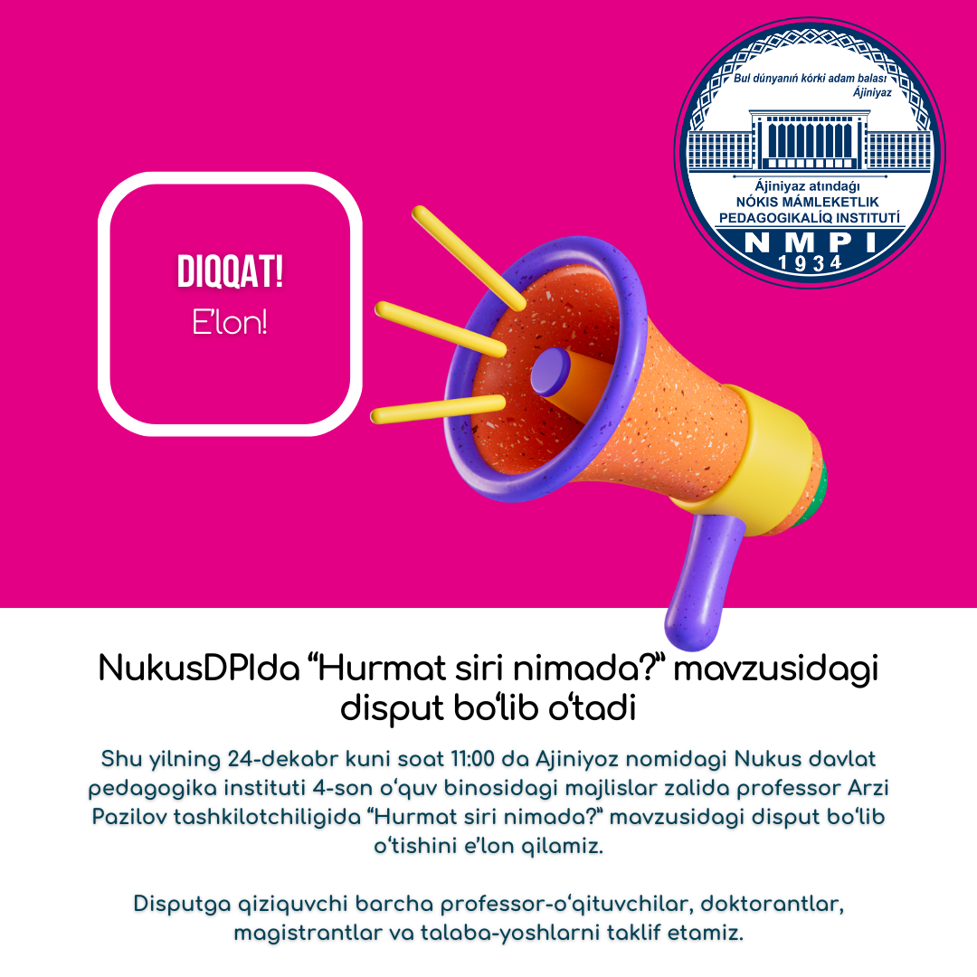 Shu yilning 24-dekabr kuni soat 11:00 da Ajiniyoz nomidagi Nukus davlat pedagogika instituti 4-son o‘quv binosidagi majlislar zalida professor Arzi Pazilov tashkilotchiligida “Hurmat siri nimada?” mavzusidagi disput bo‘lib o‘tishini e’lon qilamiz.