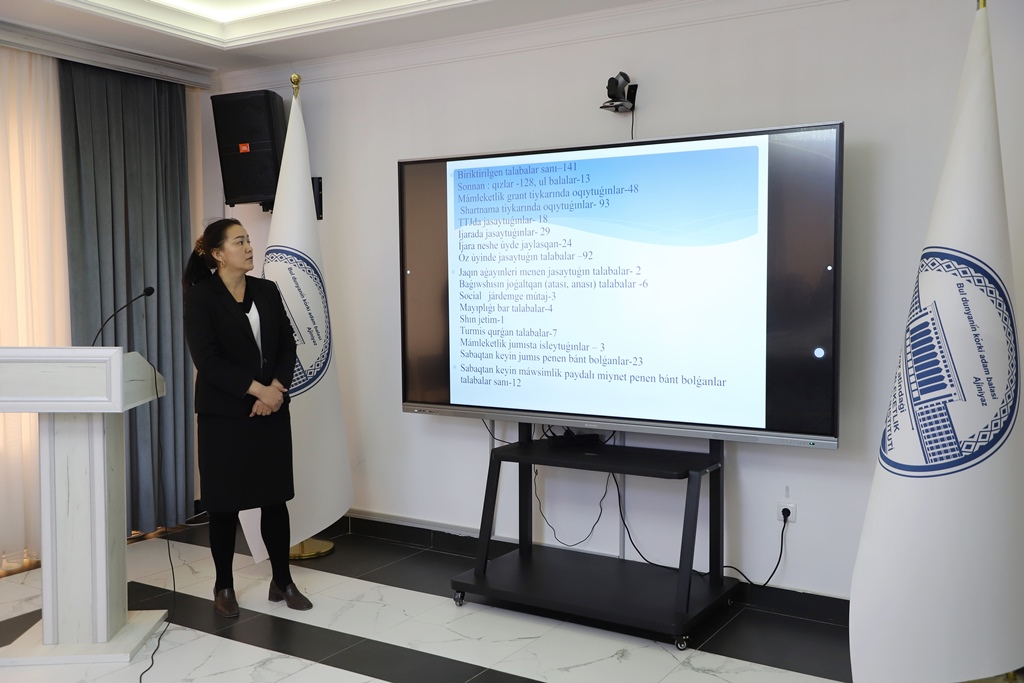 Ajiniyoz nomidagi Nukus davlat pedagogika institutida tyutorlar tomonidan 2025-yilda amalga oshirilgan ishlarning yakunlari va 2026-yil uchun belgilangan vazifalarni belgilab olishga bag‘ishlangan taqdimotlar o‘tkazilmoqda.