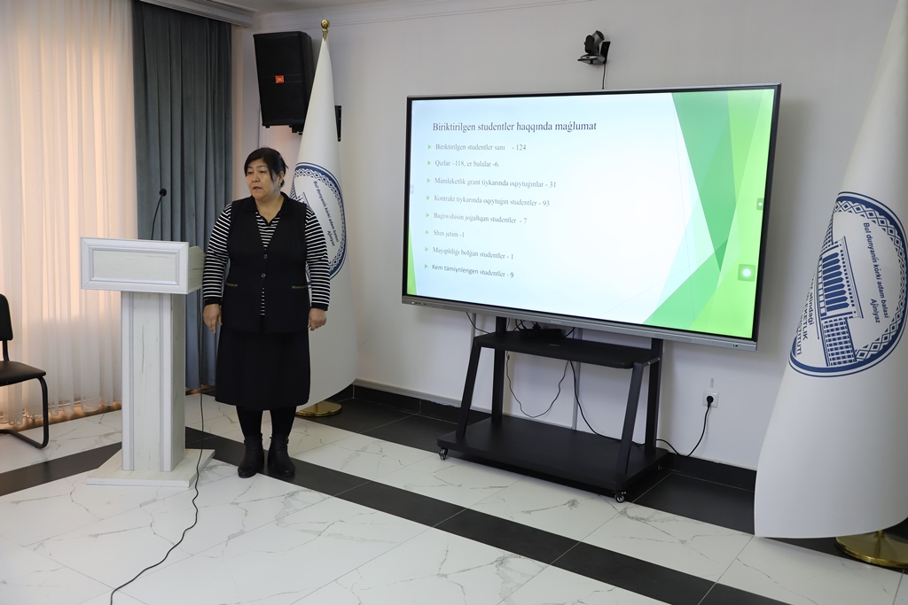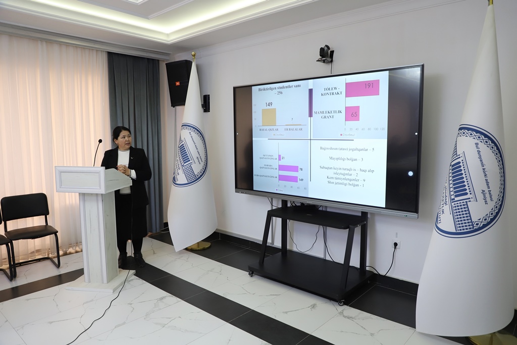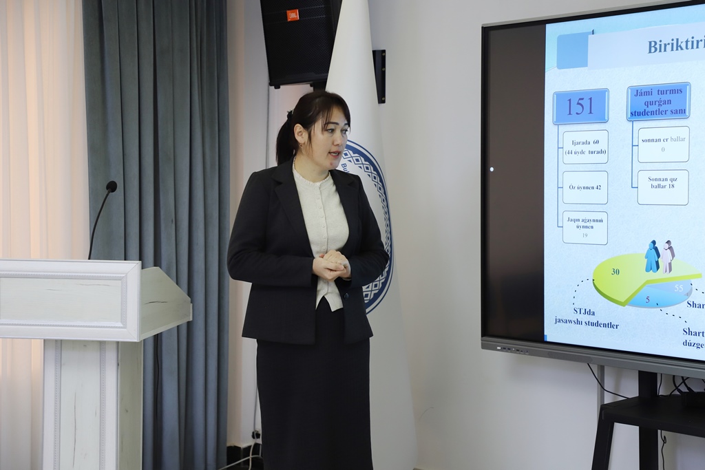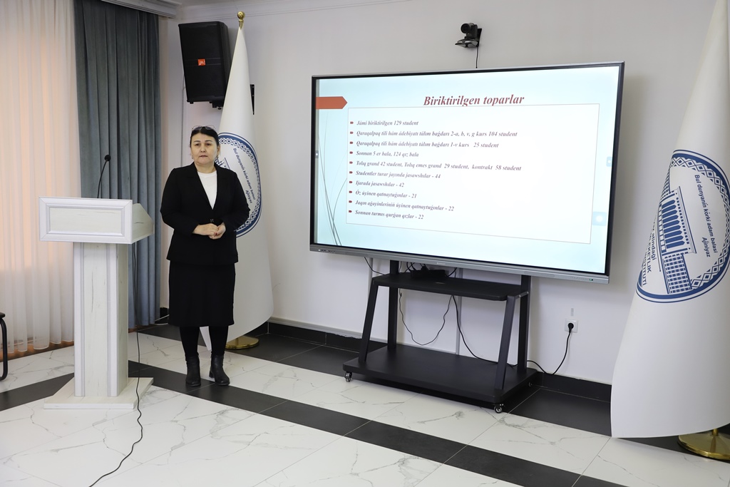 Ajiniyoz nomidagi Nukus davlat pedagogika institutida tyutorlar tomonidan 2025-yilda amalga oshirilgan ishlarning yakunlari va 2026-yil uchun belgilangan vazifalarni belgilab olishga bag‘ishlangan taqdimotlar o‘tkazilmoqda.