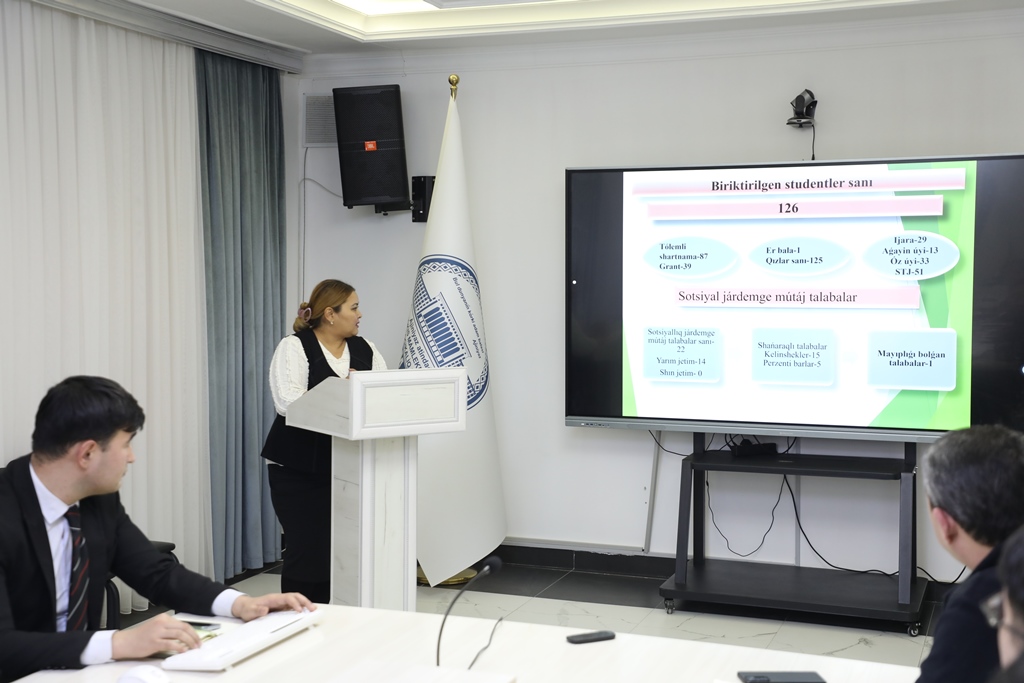 Taqdimot davomida tyutorlar tomonidan 2025-yil davomida talabalarning o‘qishga qiziqishini oshirish, ma’naviy-ma’rifiy tarbiya jarayonlarini takomillashtirish, ijtimoiy-psixologik qo‘llab-quvvatlash faoliyati, yotoqxona, ijara uylaridan xabar olish, darsdan bo‘sh vaqtlarini mazmunli tashkil etish, yoshlarning qobiliyatlarini yuzaga chiqarish va muammolariga yechim topish kabi yo‘nalishlarda erishilgan natijalar tahlil qilindi.