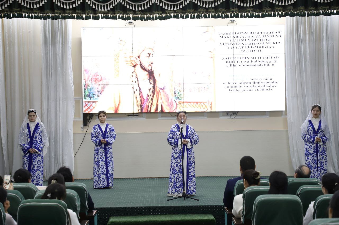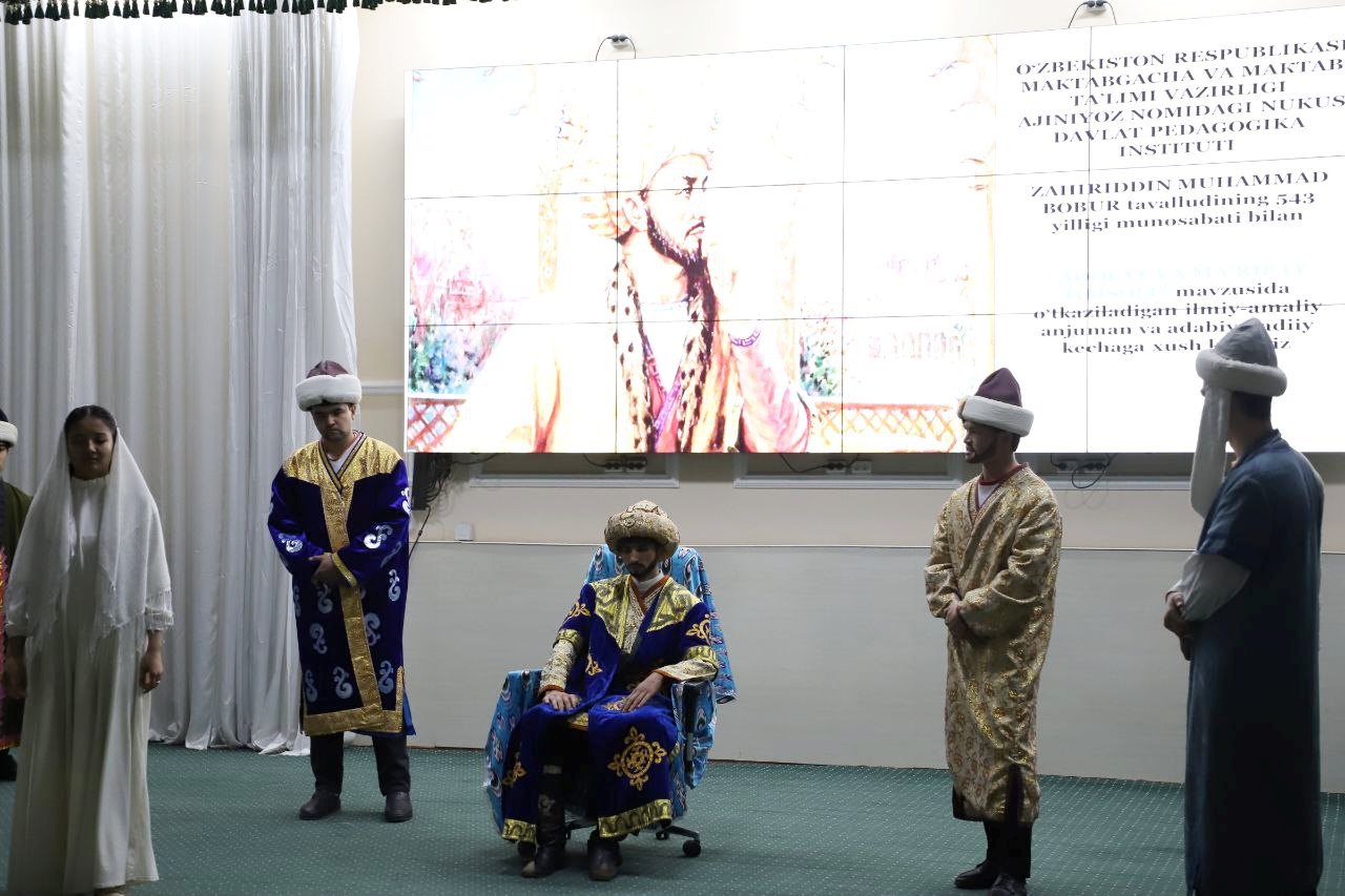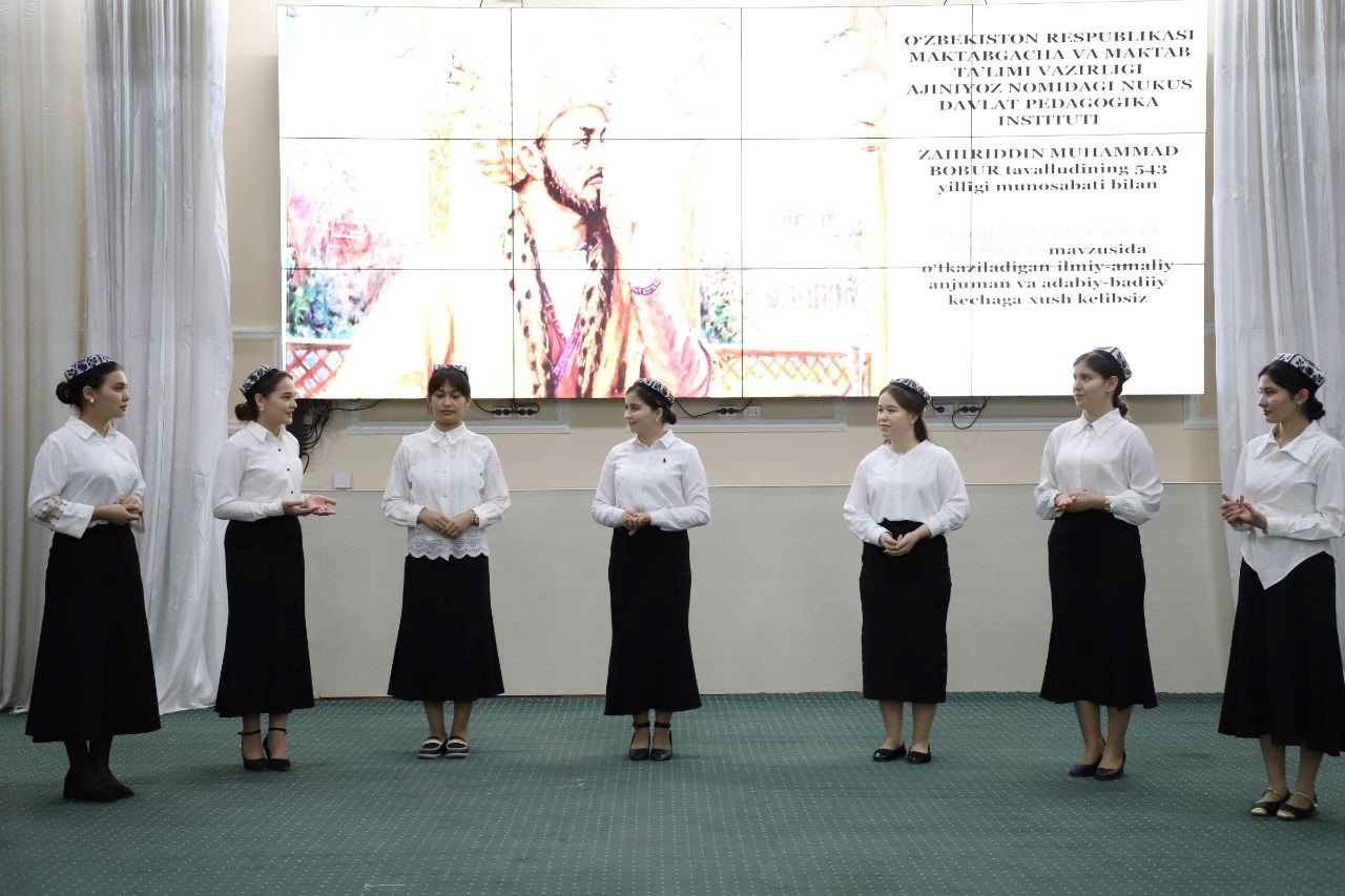 Ajiniyoz nomidagi Nukus davlat pedagogika institutida atoqli davlat arbobi, mohir sarkarda, buyuk shoir, tarixchi olim sifatida mamlakatimiz va jahon xalqlari tarixida o‘chmas iz qoldirgan Zahiriddin Muhammad Bobur tavalludining 543 yilligiga bag‘ishlangan «Adolat va ma’rifat timsoli» mavzusidagi ilmiy-amaliy konferensiya va badiiy-adabiy kecha bo‘lib o‘tdi.