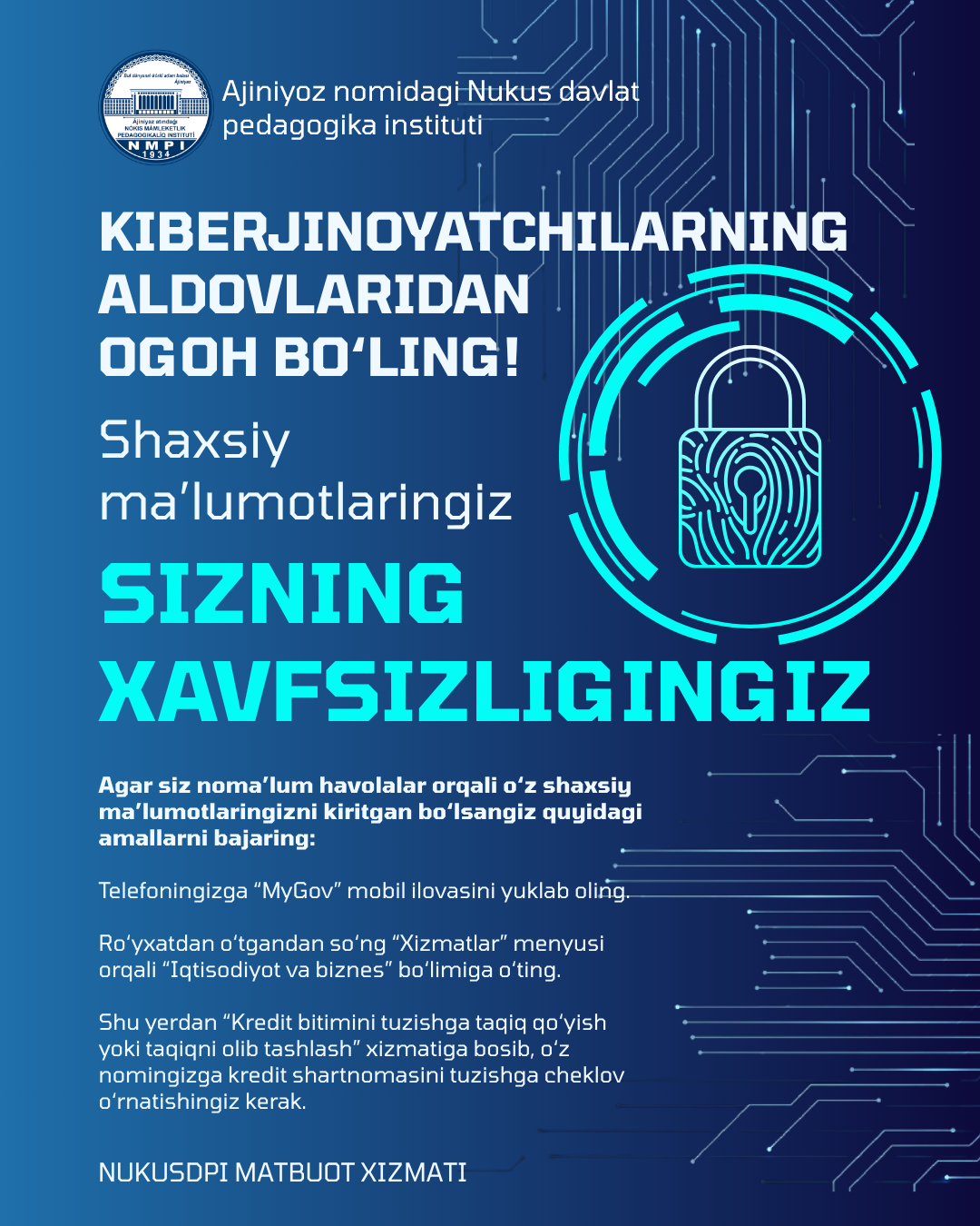 Ehtiyot bo‘ling, sizning shaxsiy ma’lumotlaringiz kiberjinoyatchilar qo‘liga tushsa, turli salbiy holatlarning kelib chiqishiga sabab bo‘lishi mumkin.